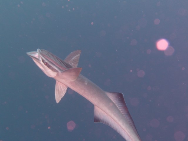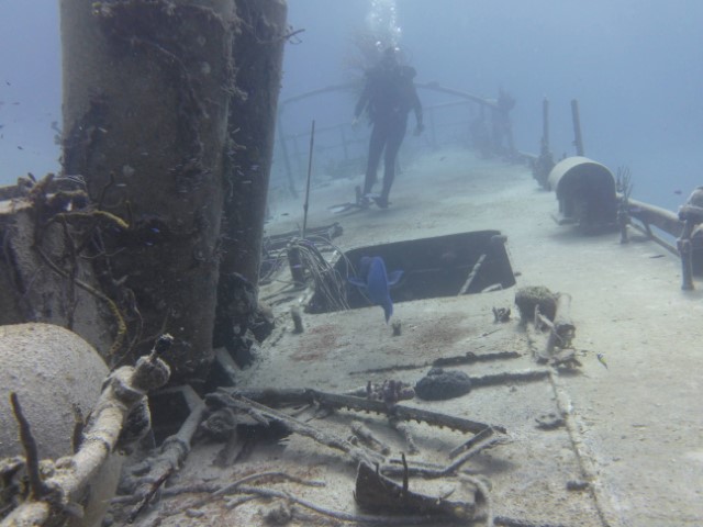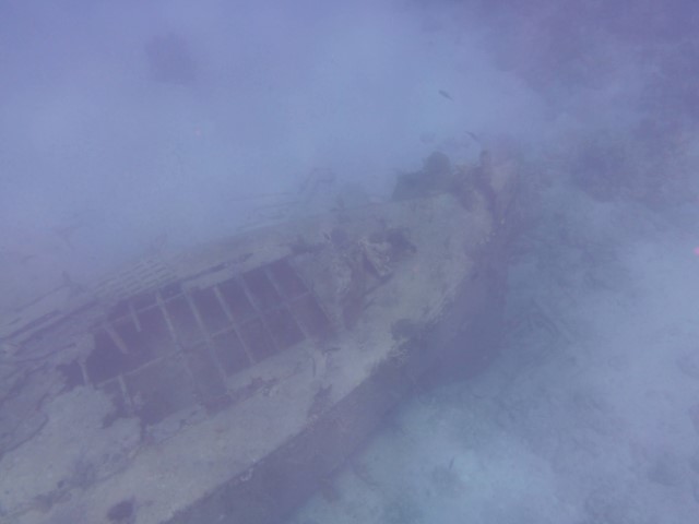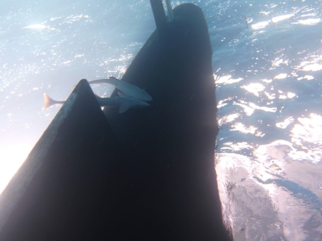An der Kante oben dann zurück. Eine Menge Haie kommen vorbei. Leider ist das Wasser eher trüb, die Fotos und Filme könnten besser sein! Die Wracks laden zu einem zweiten Besuch ein. Am Ende machen wir noch in 6 und 3 Metern eine kurze Deko-Pause. Unter der KISS tummeln sich zwei Schiffshalter. Sie scheinen zu überlegen, ob wir gute Wirte wären. Aber dann entschließen sie sich doch lieber, zu bleiben…