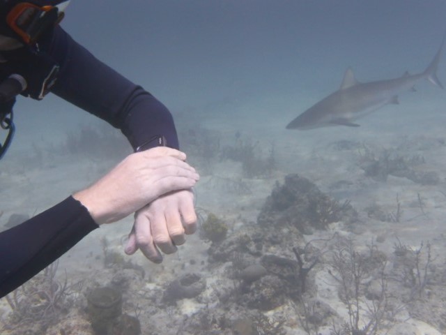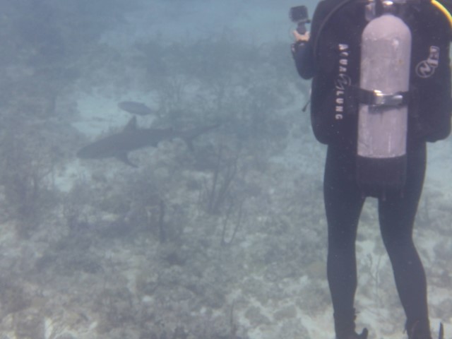 Der Morgen bringt spiegelglattes Wasser. Klar, dass ich den Anker fotografieren muss… Nun – dann mache ich mich an einige Büroarbeit und Mathe mit Anna, bevor wir starten: Heute fahren wir – insbesondere, weil unser 2. Ziel weiter weg ist, mit dem „Großen“, sprich mit der KISS raus. Zur Vereinfachung kommen sie kurz längsseits, übernehmen meine Gerätschaften und mich. Zunächst gehen wir an ein wirklich schönes Wrack. Und Haie wird das bestimmende Thema des Tauchganges. Neben uns liegen einige Tauchschulen und träufeln Fischblut ins Wasser. Zack – sind sie da!