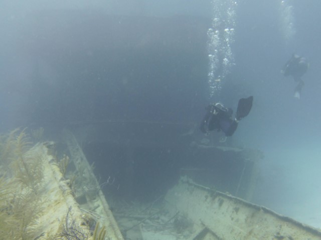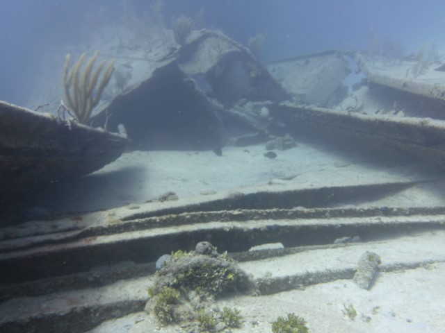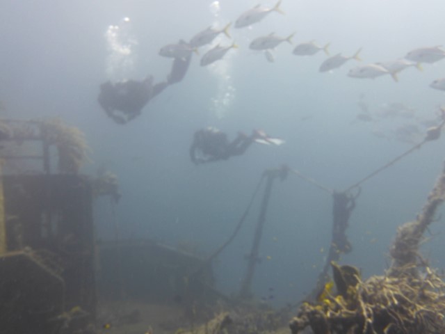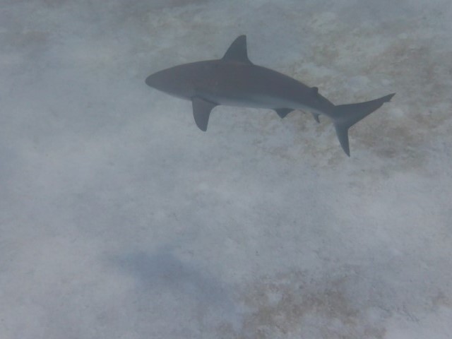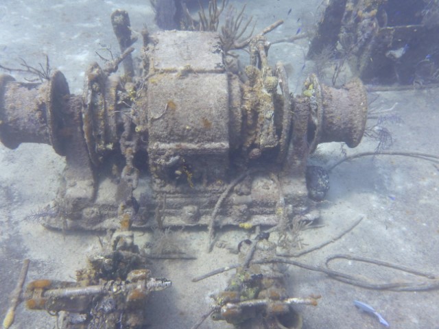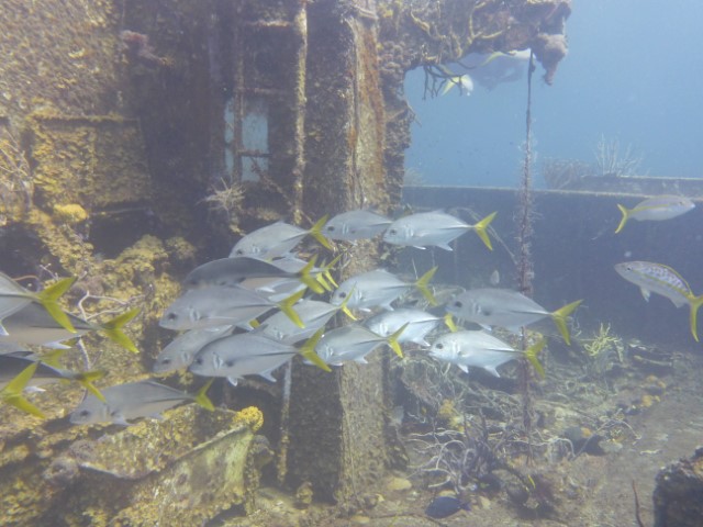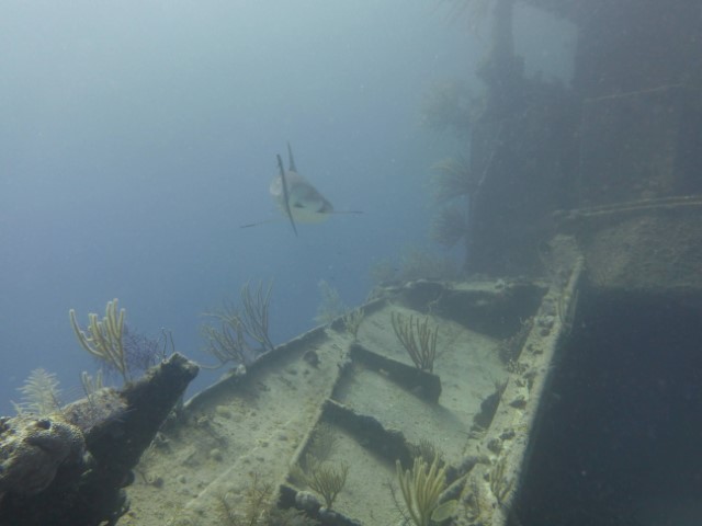 Daneben gibt es dann Fisch und Korallen auf dem Weg zu dem Wrack. Schnorchelnd konnten wir das nicht so genau untersuchen. Mit Gerät hat man alle Zeit, drum herum und ein wenig hinein zu tauchen. Auch am und im Wrack sind die Haie….