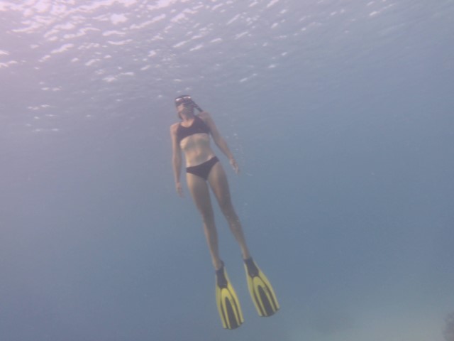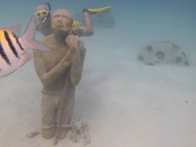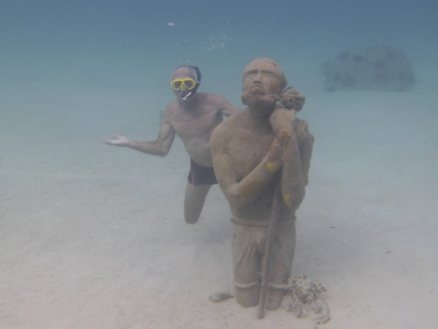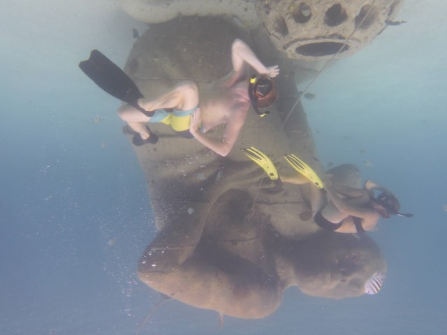 Eine kleine Pause mit Verpflegung und dann verlegen wir an einen weiteren Spot. Dort schnorcheln wir wieder. Dort gibt es eine Statue – 60 Tonnen, unter Wasser zusammengesetzt. Wir wollen einen japanese stop machen. Es wird ein wenig länger, aber Fotos haben wir dann am Ende eine Menge! Und ja: Es ist gar nicht so einfach, die Pose nach zu machen…