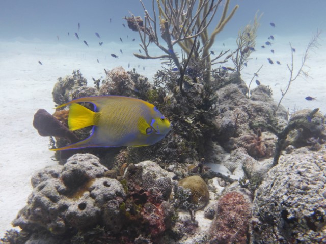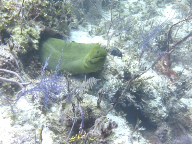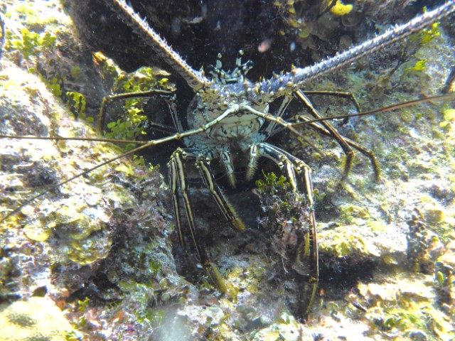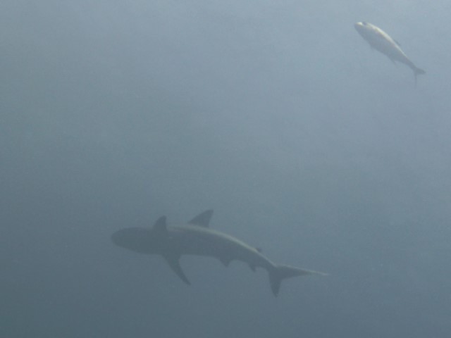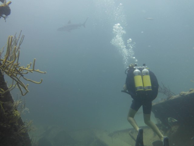 Wir machen an der schon bekannten Mooring fest. Anna bekommt eine Einweisung in die lokalen Gegebenheiten und die Taucheruhr. Schritt für Schritt muss sie immer selbstständiger werden unter Wasser. Anne und Philipp gehen direkt zu den Wracks. Wir beide gehen erst an die Kante und auf 18 Meter. Sozusagen Annas erster Tieftauchgang. Sie hält die 18 Meter prima – unter uns geht es ja noch weitere 2.000 Meter abwärts. Haie begleiten uns wieder, dann entdecken wir einen Riesen-Hummer und eine grüne Muräne.