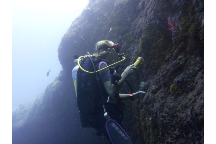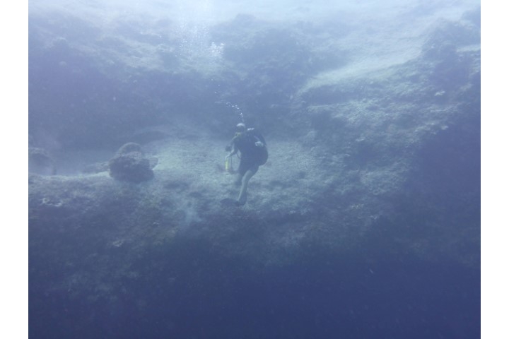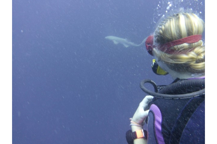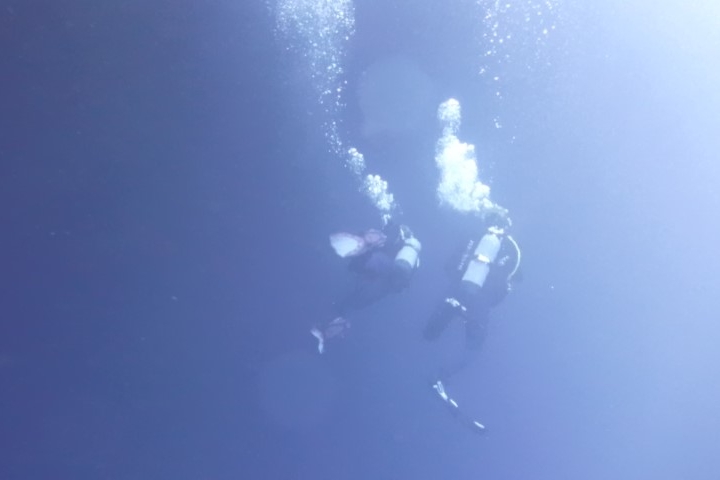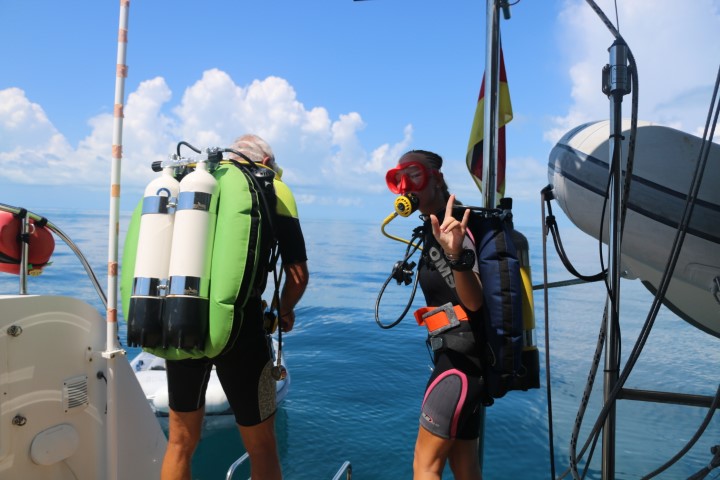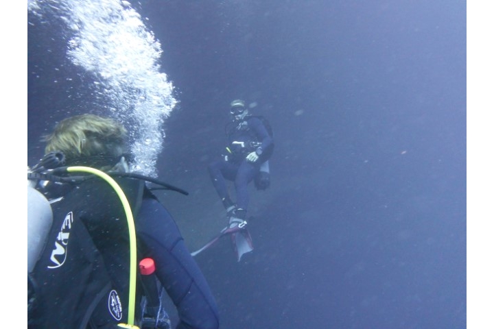 Doreen bringt Anna. Und macht dann eine nette Reihe von Fotos, wie wir ins Wasser gehen. Nach wenigen Metern sind wir an der Kante ins dunkle Blau! Dort treffen wir Anne und Philipp. Gemeinsam geht es abwärts. Plan: Rasch auf Tiefe, für Anna: 21 Meter. Dann in Spiralen an der Wand wieder nach oben. Anna möchte gerne die 25 Meter „knacken“. Im Briefing sage ich das nicht zu – es sollen am Rand Höhlen sein, ich kenne das Revier nicht. So verabreden wir, dass ich 25 anzeige, wenn ich es für ungefährlich halte. Die Höhlen entpuppen sich als Überhänge, ungefährlich! Der Weg nach oben ist nirgendwo versperrt. Also darf sie ihre Marke „machen“.