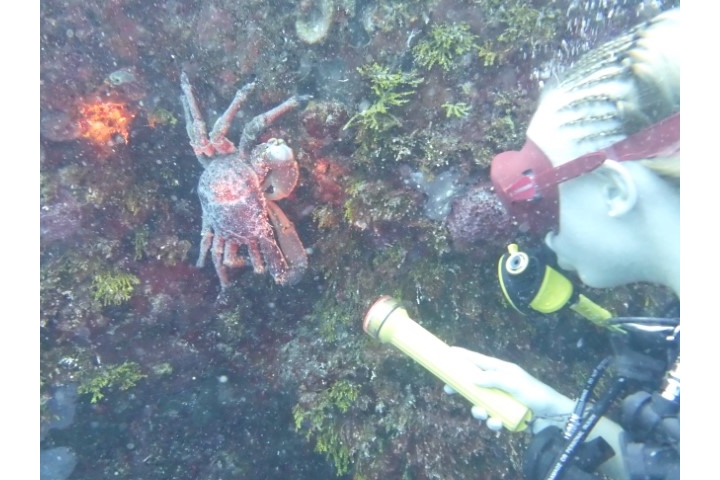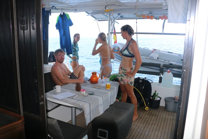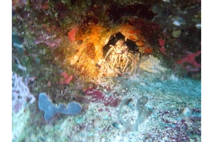 Die Idee in Spiralen dann aufzutauchen erweist sich als wunderbar. Drei oder viermal kreisen wir im Hole. Sehen einen Hai – der dreht auch so rum wie wir. Einen Hummer, einen riesigen Krebs. Und immer unter uns noch die Dunkelheit – es geht hier bis über 50 Meter runter! Und neben und über uns der Rand ins Himmelblau über uns!