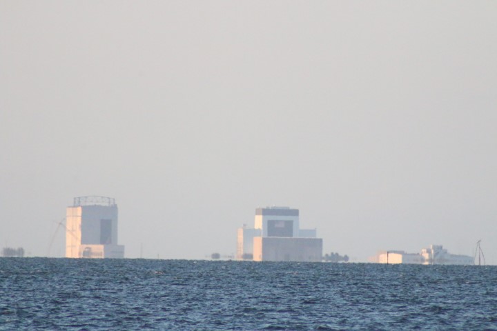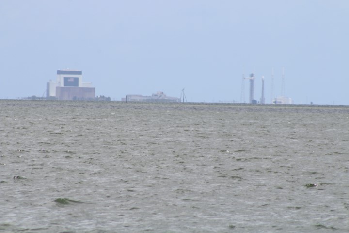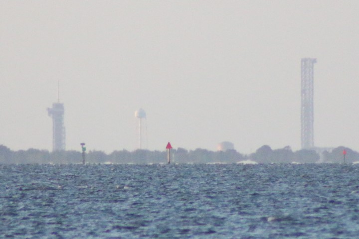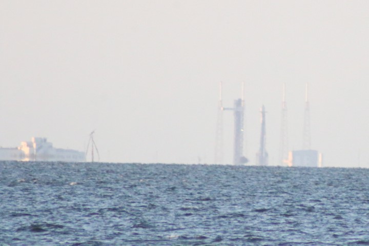 Den ganzen Tag schon schaue ich mit dem Fernglas, wo sich nun was tut. Also – irgendwann müssen sie ja die Rakete – eine Falcon 9 – aufstellen. Doch bis in den Sonnenuntergang tut sich nichts, was ich identifizieren kann.