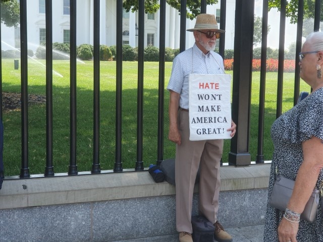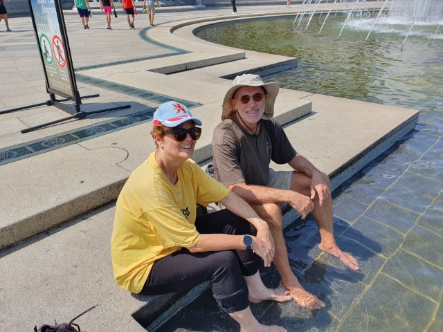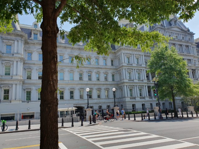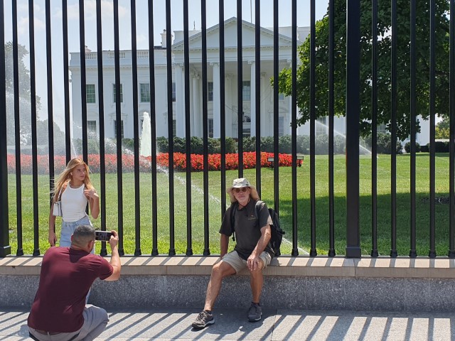 Am WWII Memorial stecken wir wieder unsere Füße ins Wasser. Inzwischen ist es ordentlich warm geworden und ich lasse mich vom Plätschern der Fontänen einschläfern. Doch mit einem munteren Auf-auf geht es weiter. Um das Washington Memorial herum. Dann Richtung Weißes Haus. Doch die Eclipse ist gesperrt. Minuten später wissen wir auch warum: Der Präsident – oder ist es Kamila? – schwebt ein. Wir treten links raus in ein Café. Als wir wieder auf der Straße sind ist es hinter dem Weißen Haus noch immer gesperrt. Den Hubschrauber sehen wir auch noch – müssen dann eben „vorne rum“.
