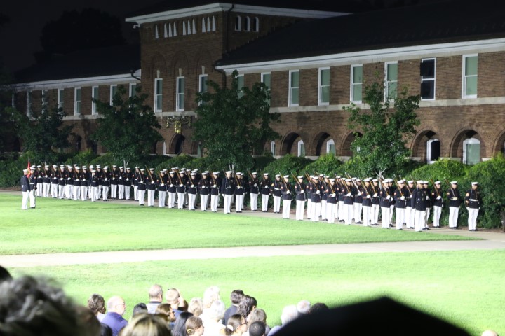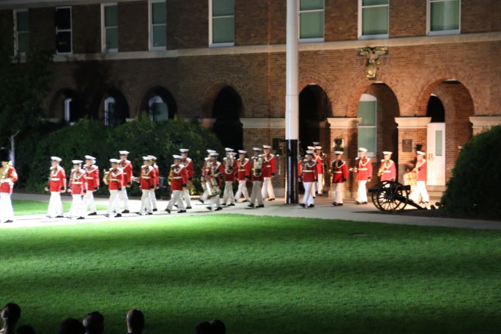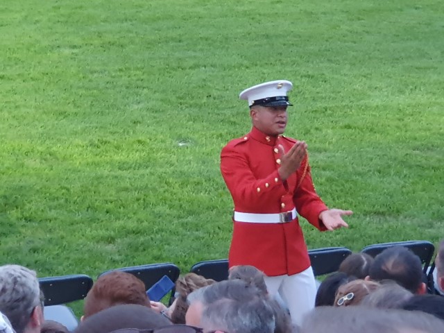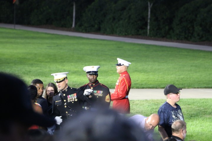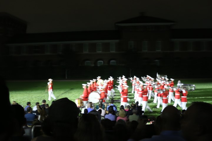Gegen 18 Uhr fahren die Crews der VITAMIN SEA und der RE dann nach Osten: Zu den Marine Barraks. Ich habe Tickets für „Gate 9“. Und den Hinweis: Sitze avaliable, first comes first served. Also sind wird kurz vor Öffnung der Gates um 19 Uhr da. Klappt auch prima, wir bekommen auf der Tribüne Plätze ganz oben. Nur: Am Ende werden alle sitzen, wir hätten auch ne dreiviertel Stunde später fahren können….