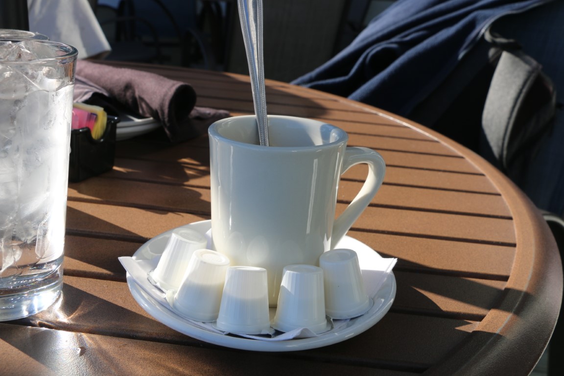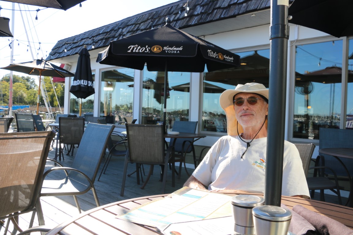 So gehen wir in das „Pirates Cove Restaurant and Dock Bar“. Cafe latte haben die nicht. Aber Michèle gibt sich dann mit Kaffee und viel Milch zufrieden. Natürlich keine Hafermilch. Und sie drängt mich, ich hatte sehnsuchtsvoll das „todays special“ angeschaut. Soll ich doch nehmen. Flunder mit Shrimps auf Pommes an zweierlei Sauce mit Salat. Nun – das lass ich mir dann nicht zweimal sagen….