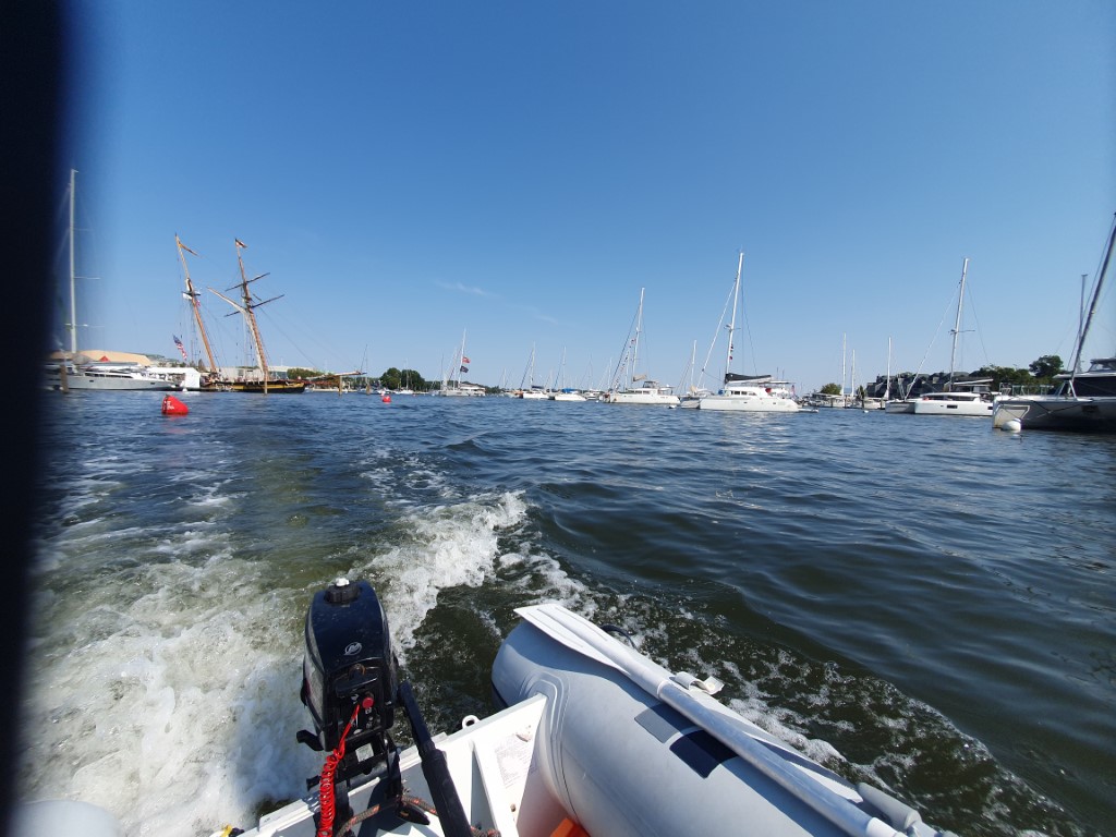 Und machen uns dann fix fertig, mit dem Dinghy zurück zu fahren. Zur Boat Show. Doreen hat uns da zwei Eintrittskarten besorgt.