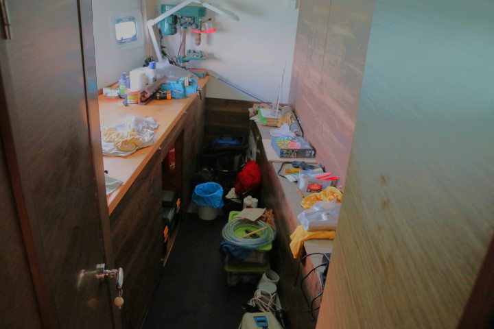 Zu guter Letzt gehe ich noch die Werkstatt kontrollieren! Oh weh! Chaos. Das Schadensbild erklärt mir, was passiert ist: RE wurde durch ein entsprechende Welle kräftig zur Seite geworfen und dann ganz abrupt in der Seitwärtsbewegung gestoppt. Nur die Einzelteile bewegten sich noch weiter. Und so liegen alle Sachen – und da ist schweres Material dabei (!) – auf der Bank an Steuerbord. Nur was da nicht mehr rauf passte, das liegt nun auf dem Boden. Ein Viertelstündchen Aufräumarbeit später ist alles seefest und gut für die nächsten Tage gestaut und gesichert.