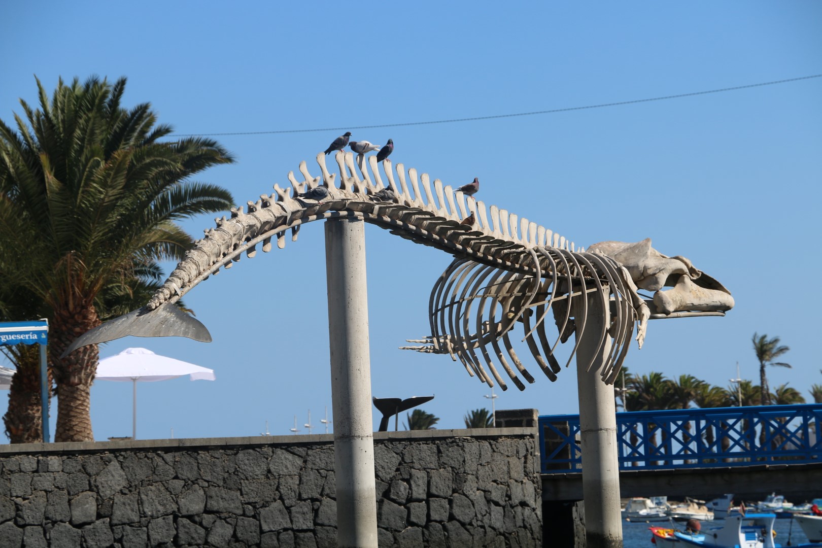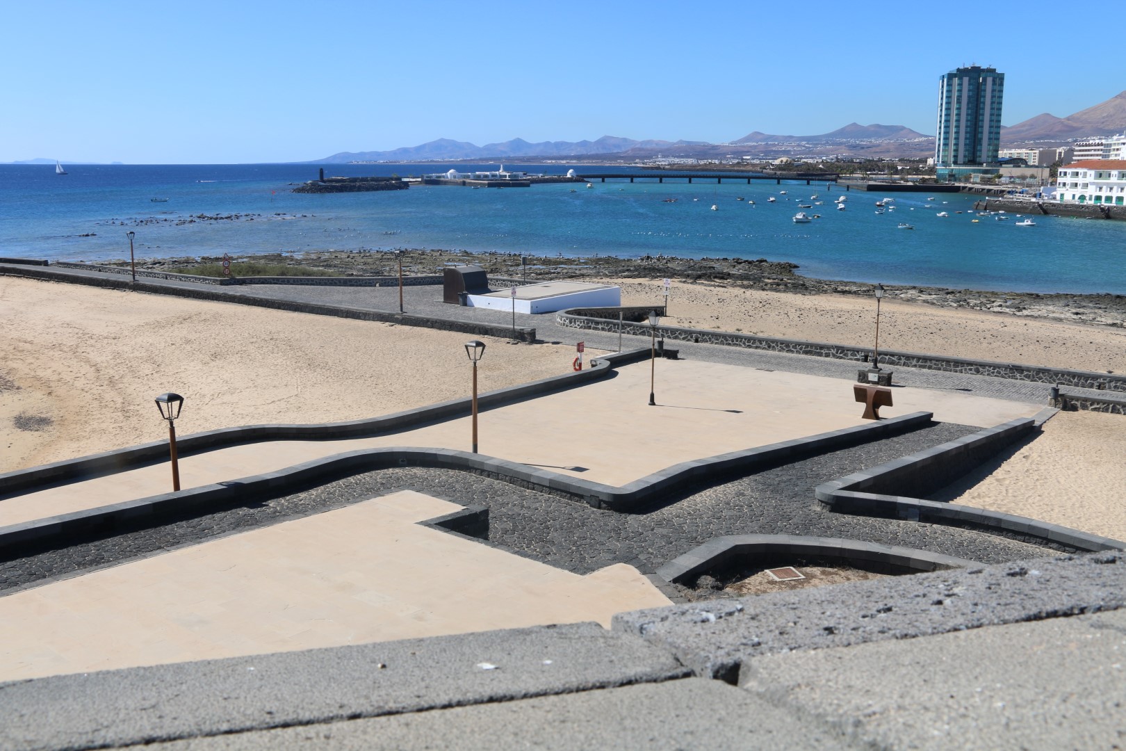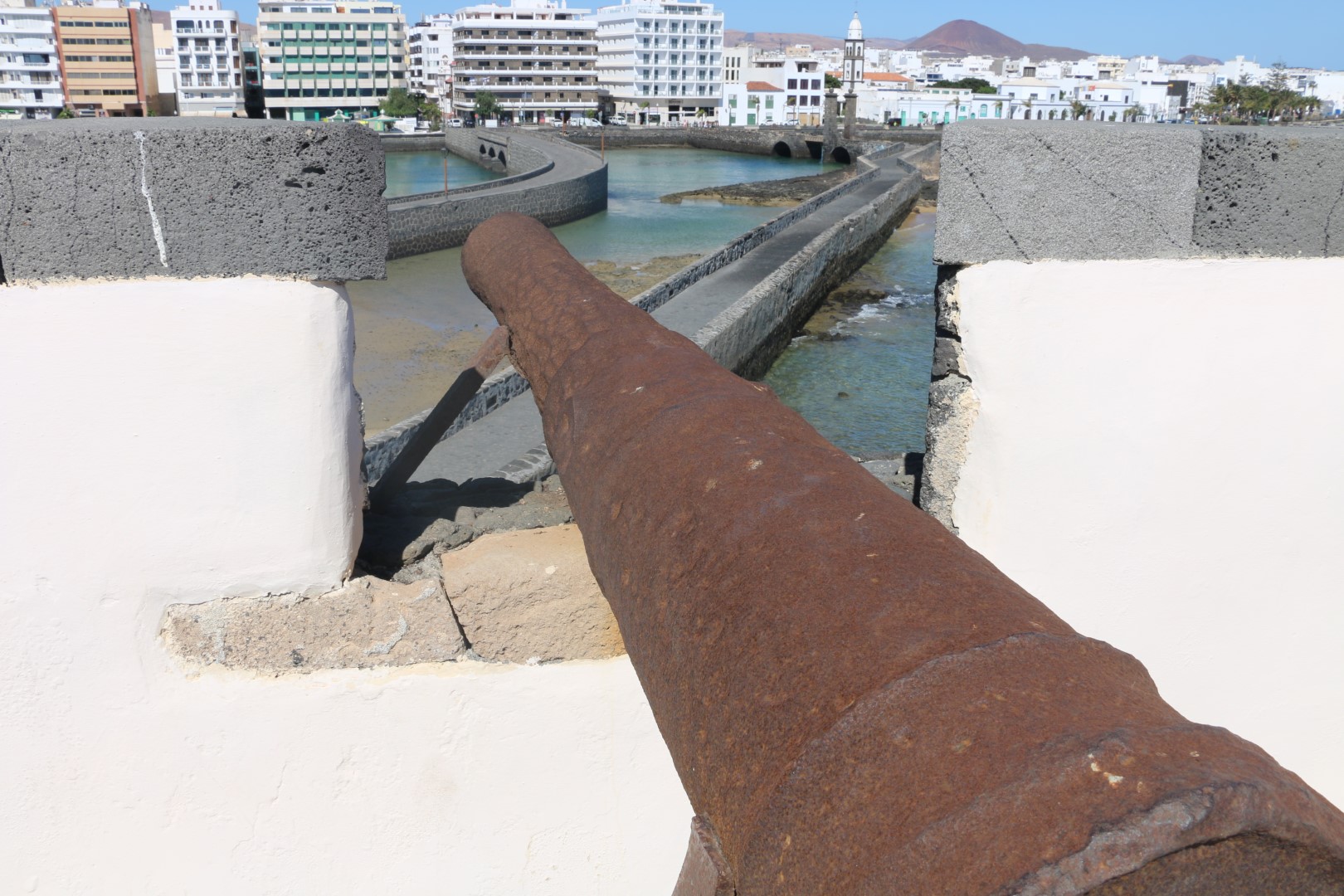 In Arrecife fällt mir gleich die weihnachtliche Straßendekoration auf, was für uns bei diesen Temperaturen einfach sehr ungewöhnlich ist. Ansonsten besichtigen wir die Lagune, Charco de San Ginés, die mit dem Meer verbunden ist. Dort schaukeln kleine, farbige Fischerboote in der Nachmittagssonnne und die Lagune ist mit kubischen Häusern in den Farben weiß und blau umrundet. Idyllisch. Danach besichtigen wir das Castillo de San Gabriel. „Diese Festung diente über Jahrhunderte als Bollwerk gegen die Angriffe der Piraten.“ Weiter zum neuen Hafen, in der Hoffnung dort einen Laden mit Yachtzubehör zu finden. Samstagnachmittags ist der allerdings geschlossen! Pech gehabt.