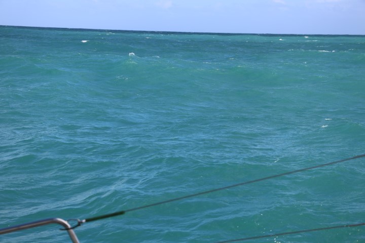 Nachmittags um 14:15 Uhr dann der letzte Logbuch-Eintrag des Tages: Groß in Reff 1. Fast schon karibische Wasserfarben um uns herum: So ein mittleres Türkis!