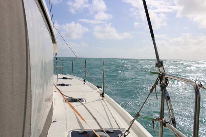 Endlich ein ruhiger Tag. Ok- wegen recht ordentlichem Wind Groß in Reff 3 gesetzt. Und wegen zu wenig Solar-Ladung dann den Motor für 2,5 Stunden laufen lassen, zumindest die 12 V Batterie wieder auf 60% bringen.