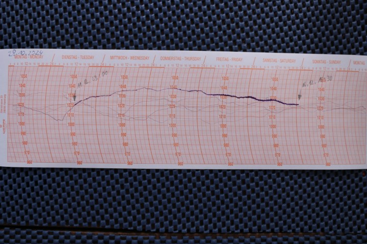 Und dann wird das Barografen-Papier ausgewechselt. Ok – für die, die das nicht kennen: Der Barograf ist ein uraltes Instrument, das den Luftdruck auf Papier aufzeichnet. Normalerweise lasse ich immer zwei Wochen auf ein Blatt zeichnen. Mit dem Werftaufenthalt sind es nun 5 geworden. Und es hat sich mal richtig was getan! Man sieht das Auf und Ab, das mit Frontdurchgängen verbunden ist. Und kurz vor der dickeren Linie, die durch entsteht, dass der Stift bei dem Stampfen in den Wellen ein wenig nach unten und oben federt, sieht man die Stelle, wo es von deutlich abwärts in ordentlich aufwärts geht. Das war der erste Moment, in dem ich dann losfahren wollte. Doch dann kommt die Seitwärtsbewegung: Zu viel Wind. Und endlich, mit dem ersten Pfeil markiert, beruhigt sich die Aufwärtsbewegung und wir konnten los!