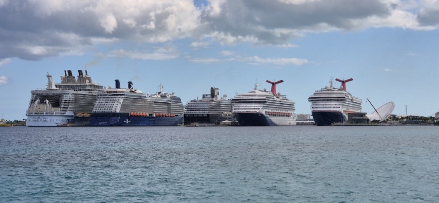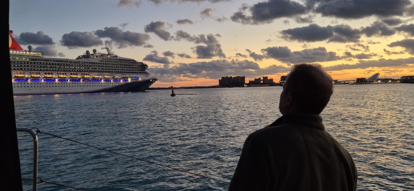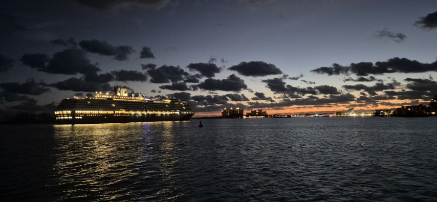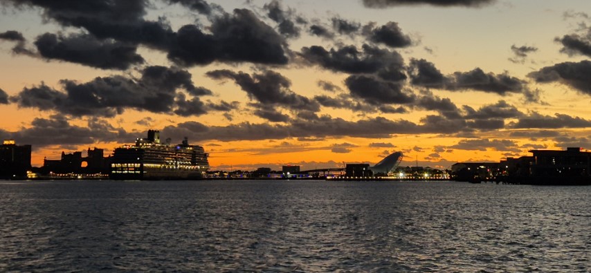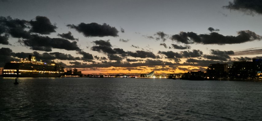 Schon morgens waren die hereinpurzelnden Kreuzfahrer eine Attraktion. Abends dann wieder, wenn sie rausfahren. Sie bilden dann wieder eine nette Perlenkette, die zum Horizont ziehen. Wir bekommen währenddeseen einen Christstollen und Weihnachtsgebäck zum Kaffee!