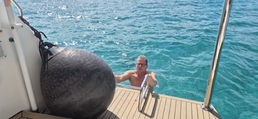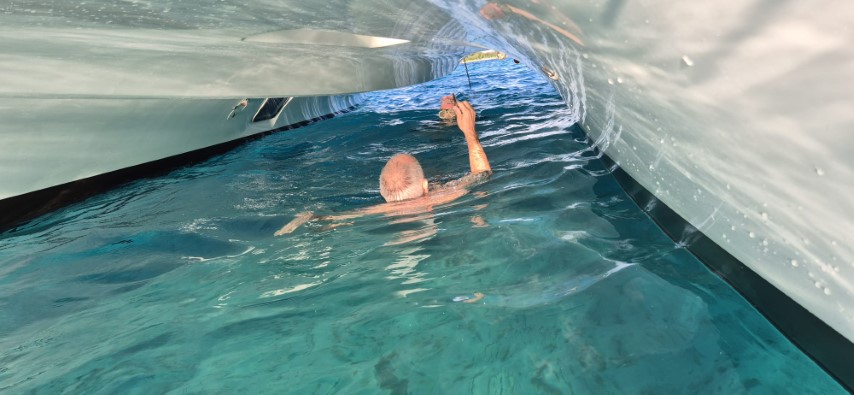 Mit Peter als Unterstützer beginne ich die Abdichtung der drei Löcher im Rumpf: Heute erst mal glatt raspeln und mit Süßwasser spülen. Dann mit einem Panzertape abdichten. Über Nacht kann es nun trocknen und morgen will ich die Löcher mit Epoxy dicht setzen.