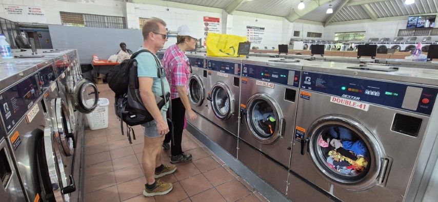 Als alle an Oberdeck sind, schiffe ich meine Drei aus: Michèle will einmal Wäsche waschen. Dazu schicke ich sie in meine Lieblingswäscherei! Gegenüber ist der Supermarkt, da wollen die beiden Anderen Frischsachen holen. Und ich hab ein wenig Ruhe, alles an Bord in Ordnugn zu bringen und ein wenig Büro-Kram zu machen.