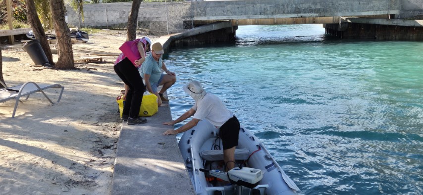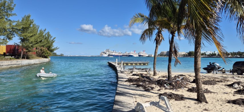 Kurz vor 4 nehme ich die Segel runter, die letzte Meile wird unter Motor zurück gelegt. Und dann macht es Plop – plop – plop! Und meine drei sind an Oberdeck. So abgesichert läuft RE in der Jankanoo-Beach vom Hafen Nassau ein. Entgegen Michèles Befürchtungen „zu Weihnachten wird da alles überlaufen sein, wir werden keinen Ankerplatz bekommen, sind wir das einzige (!!) Boot. So leer habe ich die Bucht noch nie gesehen.