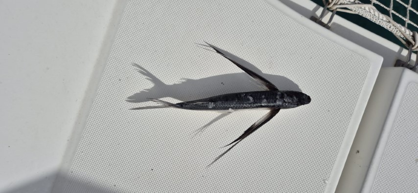 Auf dem Vordeck entdecke ich eine Leiche! Die Crew wird zusammen gerufen, um ein anständiges Seebegräbnis zu zelebrieren. Melanie macht einige Fotos. Und ganz pietätslos muss ich dann noch die Flügel ausbreiten. Tschüß, fliegender Fisch!