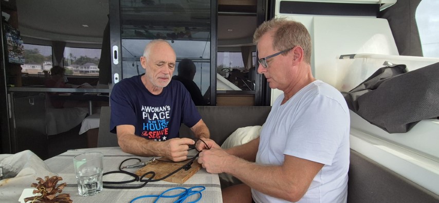 Mittlerweile ist es Nachmittag. Melanie und ich (Peter) bekommen von Christian eine kleine Knotenschulung, damit wir sicherer beim Anbinden von Tampen (Seilen) werden und keine „bahamajanische Tüttelknoten“ binden. Den einfachen Palstek (zum Binden einer Seilöse/-auge, die sich nicht zusammenzieht) und dem Webeleinstek auf Slipp und Sicherung (ein Knoten der sich bei Spannung/Zug nicht öffnet, zieht man am anderen Ende des Knotens/Seilende, öffnet sich der Koten restlos).