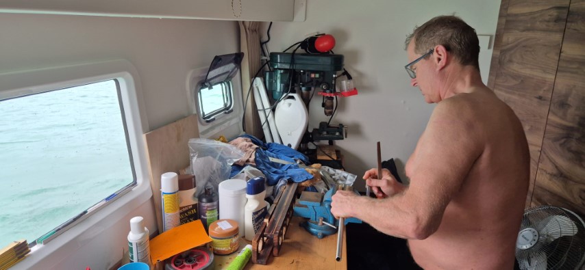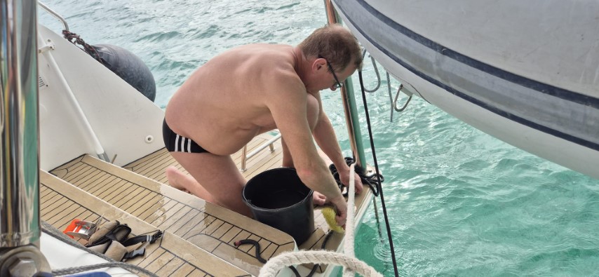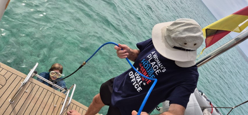 Beim Abspritzen der Ankerkette einen Tag zuvor hat der Wasserstahl an Druck verloren, es galt die Ansaugöffnung von außen zu kontrollieren. Das zweite war, dass von außen ein Stück Neopren über den Blindstopfen von außen unter dem Boot angebracht werden musste, damit beim Wechsel des Blindstopfen und Einsetzen des Forwardscans kein Wasser in das Bootsinnere gelangt.