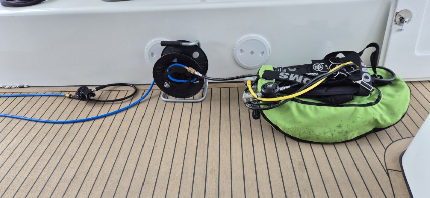 Dafür hatte Christian ein 25 kg schweres Gewicht an ein dickes Seil gebunden und bis kurz vor dem Meeresgrund abgelassen, Wassertiefe ca. 3m. Damit sich der Tauchschüler auf seine Atmung besser konzentrieren kann, hatte er am einen Ende eines 25 m langen Druckluftschlauches, Pressluftflaschen und am anderen Ende einen Atemregler (Mundstück) angeschlossen. Dadurch musste man nicht von Anfang an mit den Flaschen ins Wasser gehen.