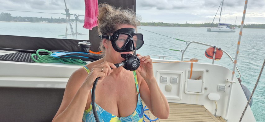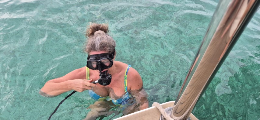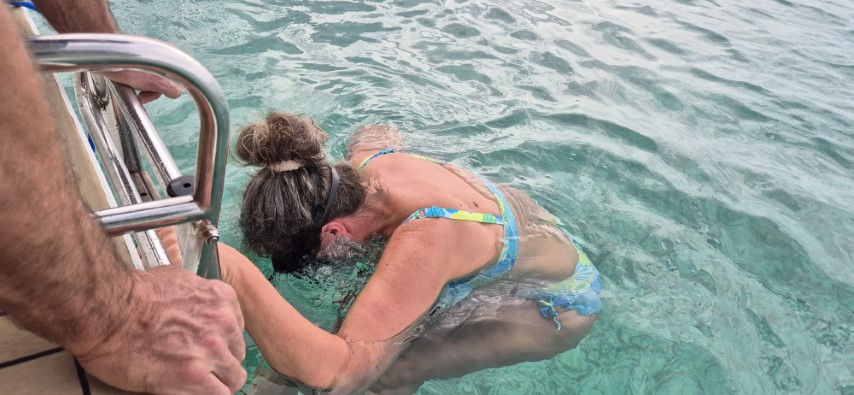 Zum Schluss ging Michèle ins Wasser. Bei Michèle dachte ich immer, dass sie bereits schon einmal mit Atemgerät getaucht sei. Auch bei ihr war das das erste Mal mit einem Atemautomat unter Wasser. Einen Vorteil hatte Michèle: sie schnorchelt, wenn es sein muss Stundenlang. Sie hat keine Probleme mit dem Kopf unter Wasser zu gehen, auch war es für sie von Anfang an kein Problem mit Atemautomat zu atmen. Sie bekam noch Gewichte, damit der natürliche Auftrieb des Körpers austariert wurde. Der Druckausgleich war für sie ebenfalls kein Problem. Im Gegenteil, nachdem sie das Seil, das am Boot befestigt war, am Boden verlassen hatte, schwamm und spazierte sie soweit der Druckluftschlauch reichte über den Boden.