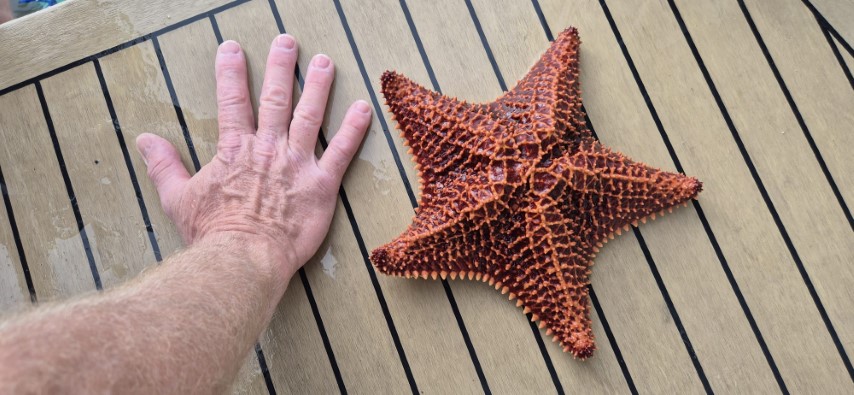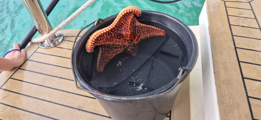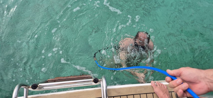Christian hatte mir zwischendurch zu verstehen gegeben, er habe da einen kleinen Tauchauftrag, der zu erledigen wäre. Das Wasser war sehr ruhig und hatte bereits 26 Grad.