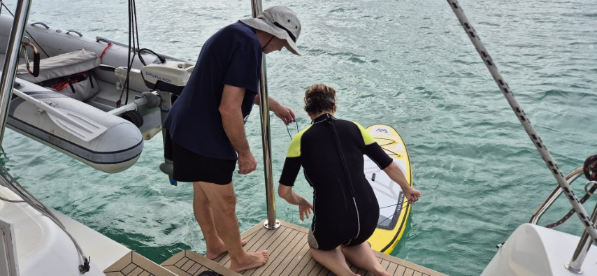 Die erste war Melanie, allerdings nicht gleich im Wasser, im Trockenen auf dem Boot, erst mal Vertrauen bekommen und merken, dass die Luft immer da ist beim Atmen. Melanie hatte ihre normalen Reflexe gezeigt. Da sie etwas im Mund hatte und der Mund im Prinzip voll war, atmete sie einfach durch die Nase.