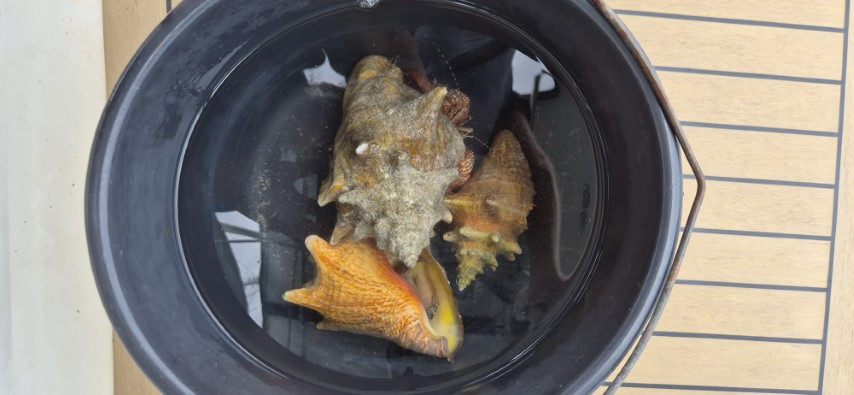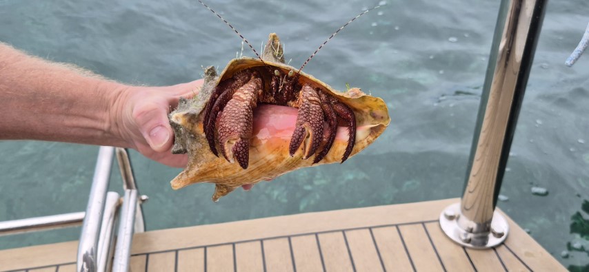 Auf dem Rückweg fand ich noch 3 verschieden große Conch-Muscheln. Zwei waren von Einsiedlerkrebsen bewohnt und in einer lebte noch eine Conch (siehe Bilder). Natürlich gab es auch wieder einige Seesterne und anderes in der Unterwasserwelt zu sehen. Nicht, dass ihr nun denkt, wir hätten die Tiere aus den Muscheln zubereitet, nein, wir habe sie wieder ins Wasser zurück gelassen und anschließen ganz normal gefrühstückt.