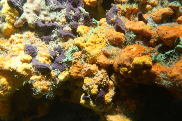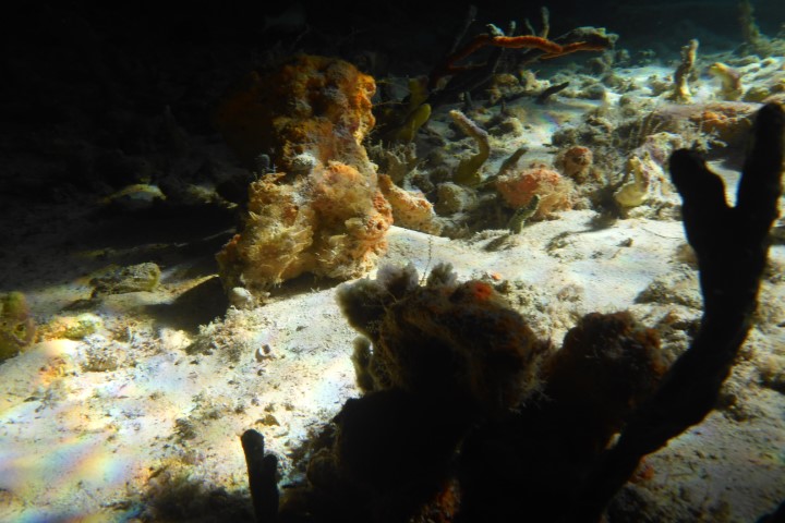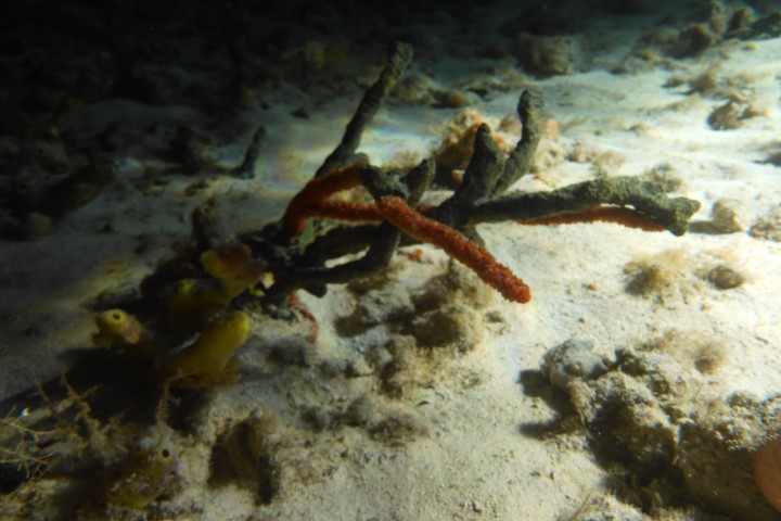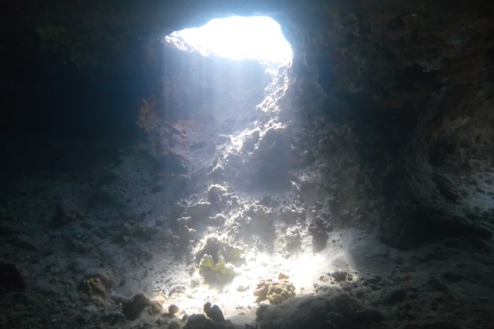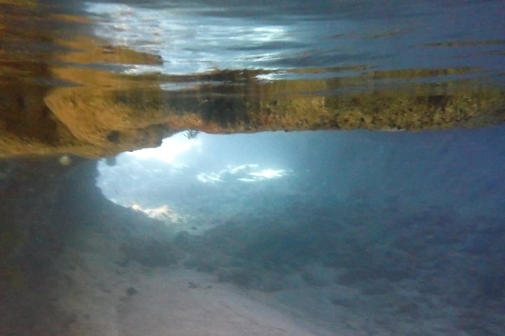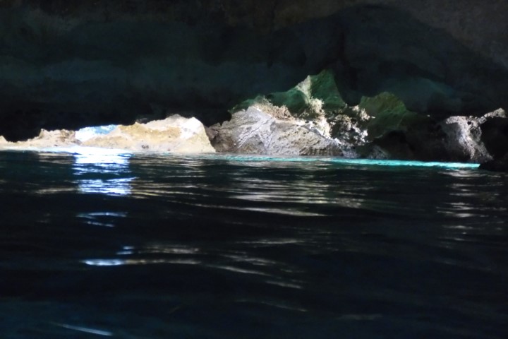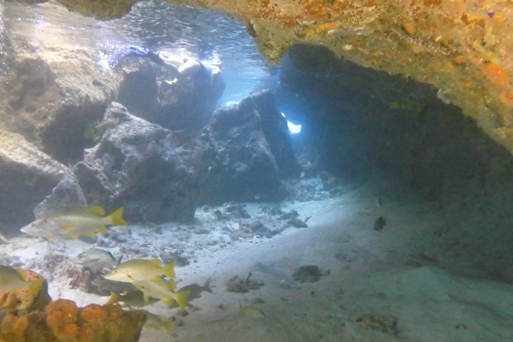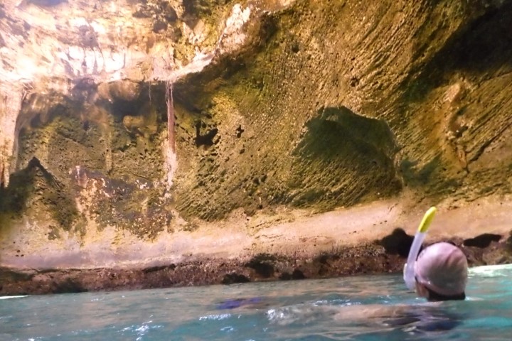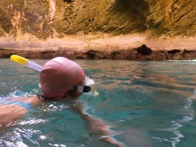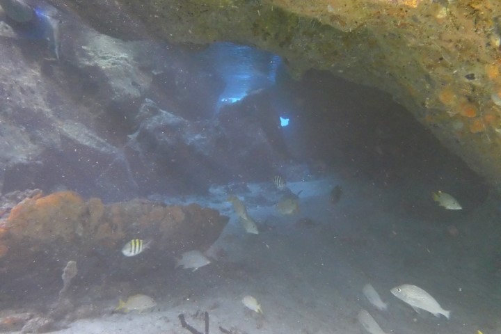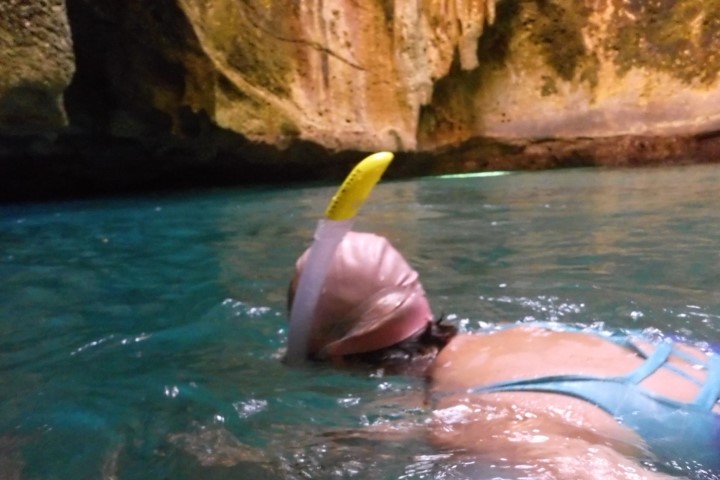 Und dann für mich vollkommen überraschend: Sie erklärt sich gnädig bereit, die Thunderbold-Grotto zu besuchen. Das sind kaum 400 Meter. Wegen der Strömung und des Bootsverkehrs mit dem Schlauchboot und nicht hinschwimmen. Für mich ist es ja inzwischen gewohntes Terrain. Doch heute gibt es auch für mcih Neues: Eine Schildkröte grast hier. Den Rest erzählt der Film besser: Siehe unten! Und wir haben die Grotte ganz für uns alleine. Beim Haupteingang (darf man das so sagen? Einschwimm wäre korrekter….) ist die Tide gerade so hoch, dass wir auch noch in Nebenhöhlen schwimmen können und einen weiteren Eingang entdecken. Ach ja – auch hier ist eine Schildkröte!
