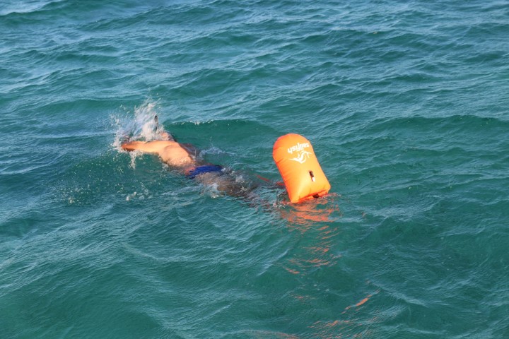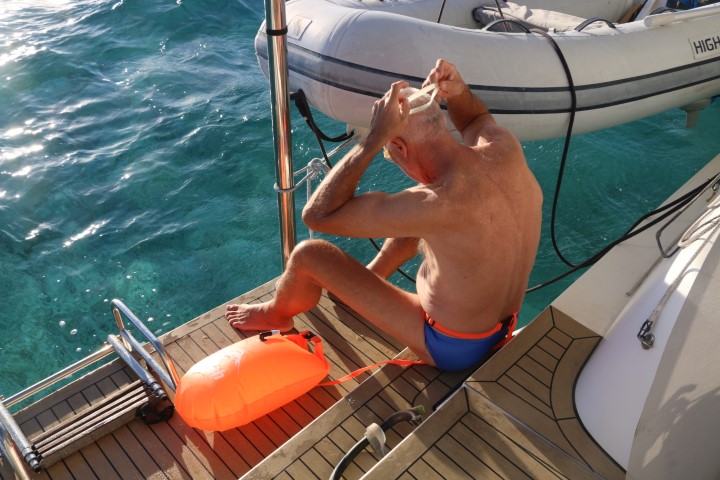 Als ich erwache, kommt Michèle gerade aus dem Wasser. 30 Mal hat sie den Anker besucht. Nun – dann kann ich mich nicht lumpen lassen. Aber nicht ständig umdrehen. Das Ufer ist bald 700 Meter entfernt. Das ist doch eine gute Strecke!