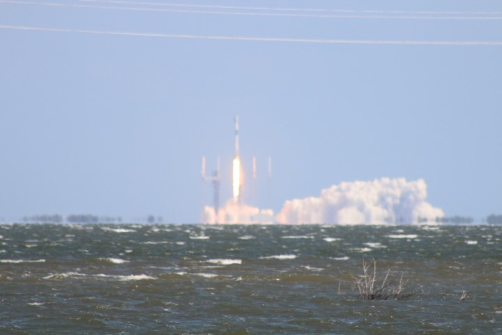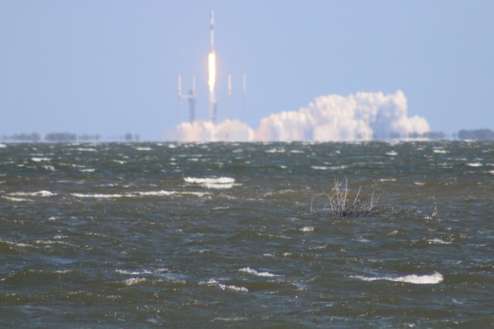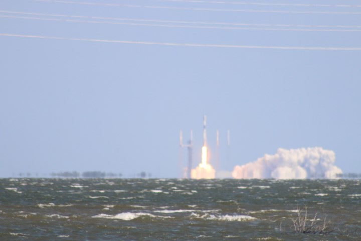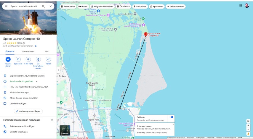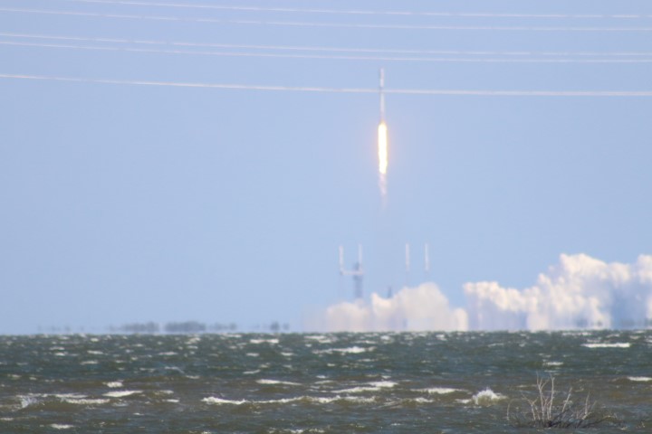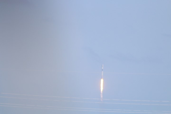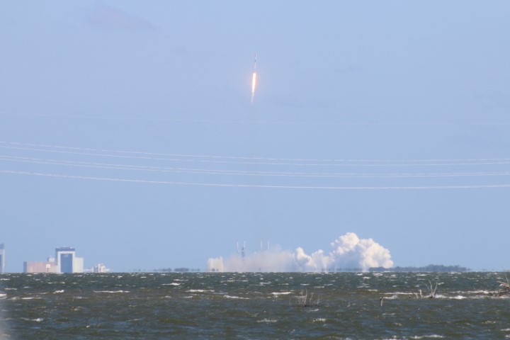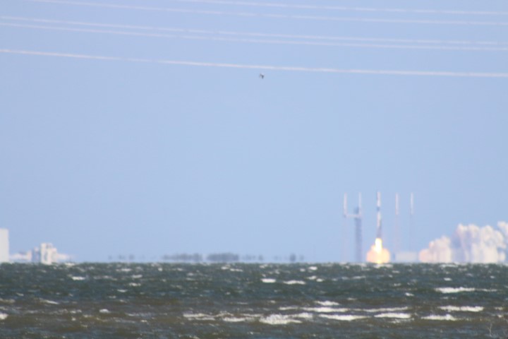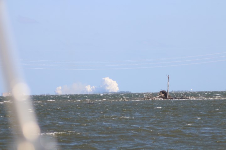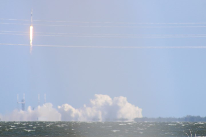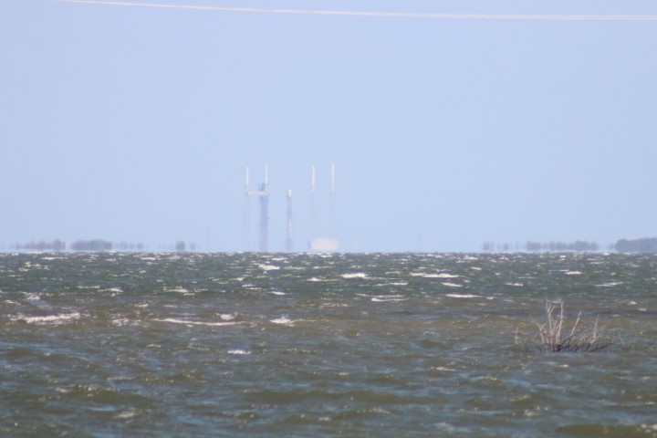Gegen halb zehn versammelten sich eine Menge Autos am Ufer. So früh? Noch mal den Starttermin gecheckt: Oh – auf 10:00 Uhr vorgezogen. Also starte ich den Life-View, der rund um die Uhr läuft. Bei Minute 21:30 kommt eine interessante Szene: Gerade wird eine Booster-Stufe auf der Landeplattform nach Canaveral Port eingeschleppt!