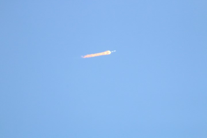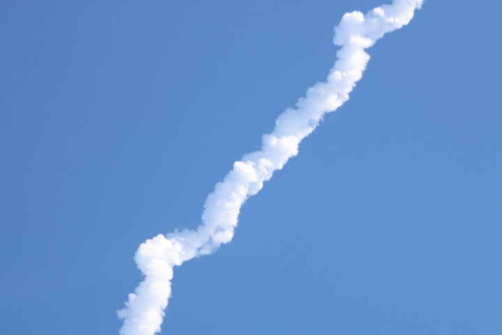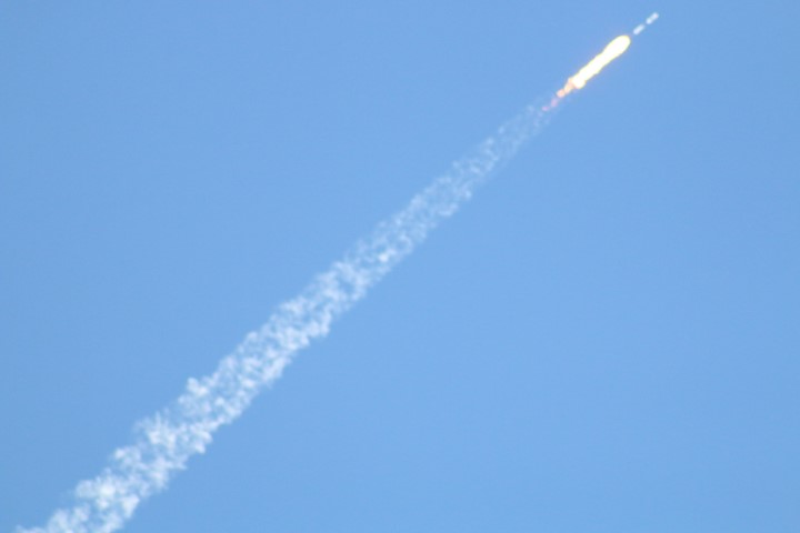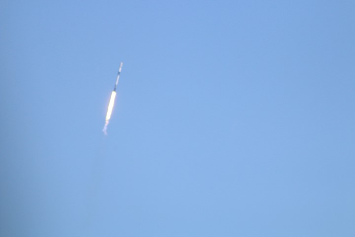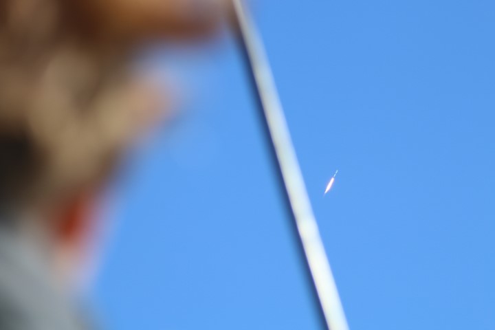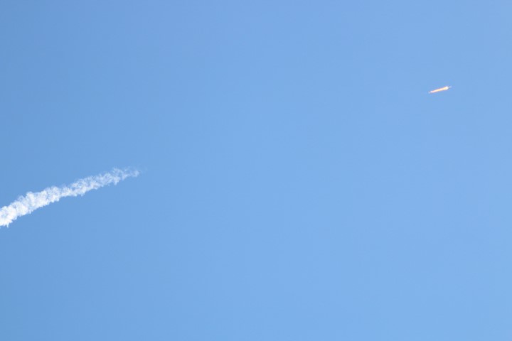 Gewitzt durch meine Raketenstarts im Juni weiß ich, dass der Stream doch ein paar Sekunden Verzögerung hat. Und so sind wir ab Sekunde 10 vor dem Countdown im Fernsehen klar. Und bei 8 kommt dann die Zündung und der Start. Eine gewaltige Wolke wird nach Osten geblasen, dann hebt die Rakete ab. Wird schneller und steigt höher. Hinterlässt am Himmel dann eine Spur. Die endet, der Feuerschweiß und selbst die Rakete sind noch gut zu sehen. Auf dem Bildschirm wird Höhe und Geschwindigkeit angezeigt. Und dann kommt die Schallwelle an! Leicht bebt der Magen mit. Grummelndes Röhren würde ich das beschreiben. Die erste Stufe ist ausgebrannt. Und nachts sieht man die Trennung, den Start der zweiten Stufe und das Bremsmanöver der ersten Stufe am Himmel. Heute bei Sonnenlicht können wir das nur im Fernsehen verfolgen.