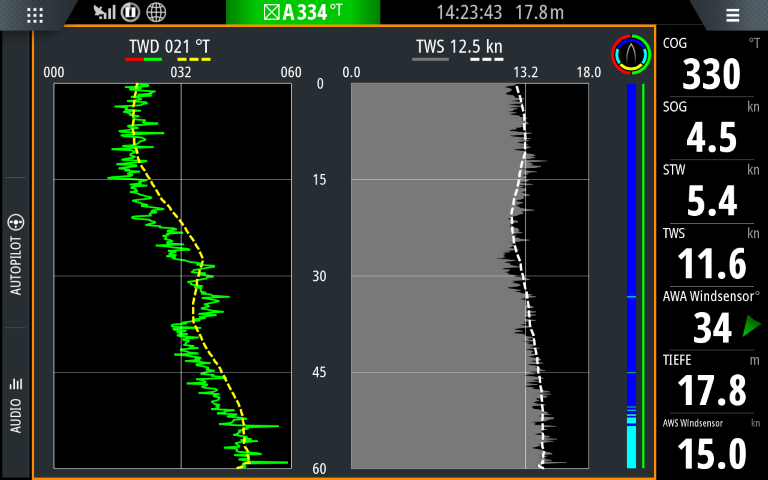 Kurz vor 13 Uhr wieder Vollzeug und Motor aus. Nach einer Stunde Fock weg, aber Motor wieder dazu. Um 14:30 dann auch das Groß bergen. Das Ganze bei Regen. Aber der variiert: Heftige Schauer lösen leise Nieselphasen ab. (Siehe Wind-Plot: Von 13 Uhr 075° Wind auf 14:30 Uhr 020° Wind...)