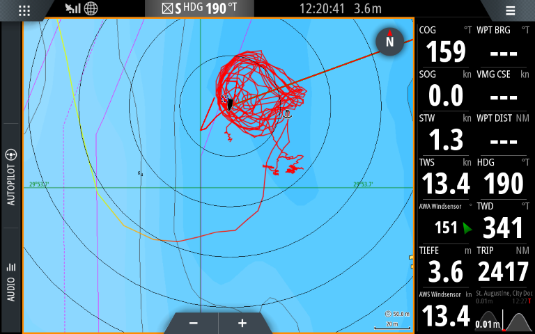 So ankern wir vor der Brücke, erst mal provisorisch mit 10 Meter Kette. Doch der Admiral entscheidet: Nö – wir bleiben hier. Das bereut sie dann im Laufe des Abends, ankern wir doch in Tidengewässern. Und gegen 20 Uhr hat der Strom dann gekentert und Wind gegen Strom lässt RE Kapriolen schlagen. In einem 10-Meter-Kreis rotieren wir wie nichts Gutes! (Siehe Bild!). Mich stört es nicht, auch wenn die Ankerkette bei mancher Drehung knackt. Is halt so….