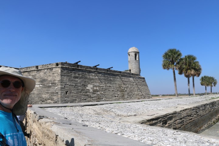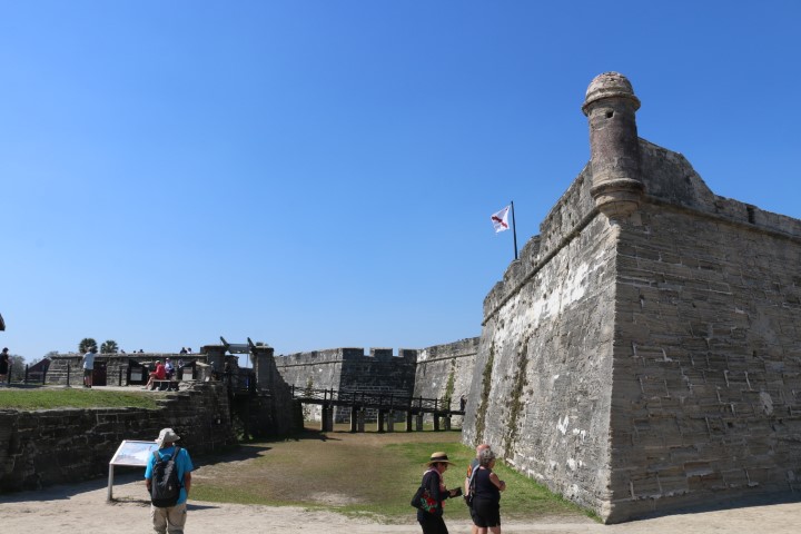 So sitzen wir in einem der nächsten Trolleys. Der Fahrer ist supergut drauf. Und wiederholt bei jedem Stopp seine Sicherheitseinweisung. Und dann kommt: „And the Trolley is now in M O T I O N!“. Auch er erklärt nonstopp. Und hat auch noch eine Menge Tripps parat. Also – dieses Museum, jenes Restaurant, diese Destillery müsst ihr besuchen! Unser nächster Stopp ist dann das „Castillo de San Marcos National Monument“. Hier ärgere ich mich, dass ich meine Nationalpark-Karte nicht dabei habe. Damit wären wir ins Monument gekommen, der Einzeleintritt von 16 $ ist uns zu viel. Und ein wenig drängt die Zeit. Mit einem Stop in einem Cafè wollen wir unsere Land-Zeit beenden. Und langsam ist es schon Nachmittag.