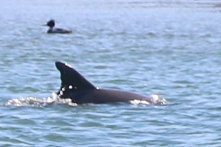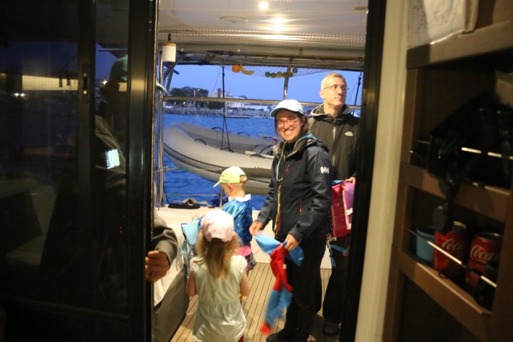 Vor Anker wird es dann nett: Eine Delfinschule mit ca. 10 Tieren jagt wohl gerade, keine 100 Meter von RE weg. Und zur Dämmerung kommt ein Dinghy auf uns zu: