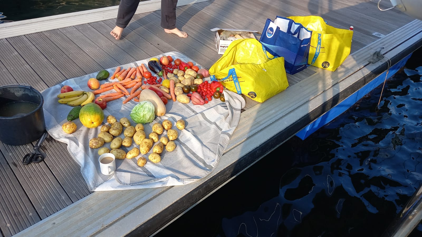 Ich bin mittlerweile fertig mit dem Abtrocknen und Reinschleppen des Grünzeugs und will jetzt endlich duschen gehen. Die Duschen sind ½ km von unserem Liegeplatz entfernt und als ich dort ankomme, merke ich, dass ich das Handtuch vergessen habe!!!!!!! Jetzt habe ich die Faxen dicke, jetzt wird an Bord geduscht! Wasserverschmutzung hin, Wasserverschmutzung her. Davon abgesehen, wenn ich mir so anschaue, welches Bootsputzzeugs da einfach so ins Hafenbecken geleitet wird, dann ist mein Seifenwasser eher noch Nektar für die Fische!