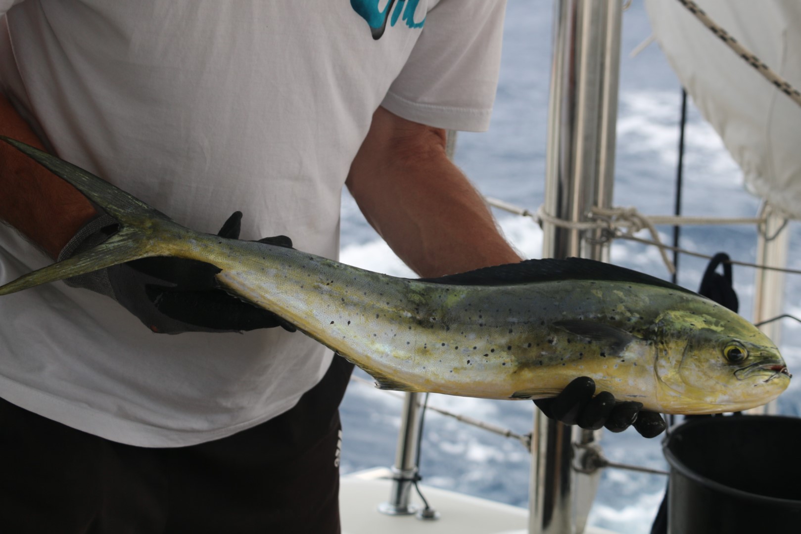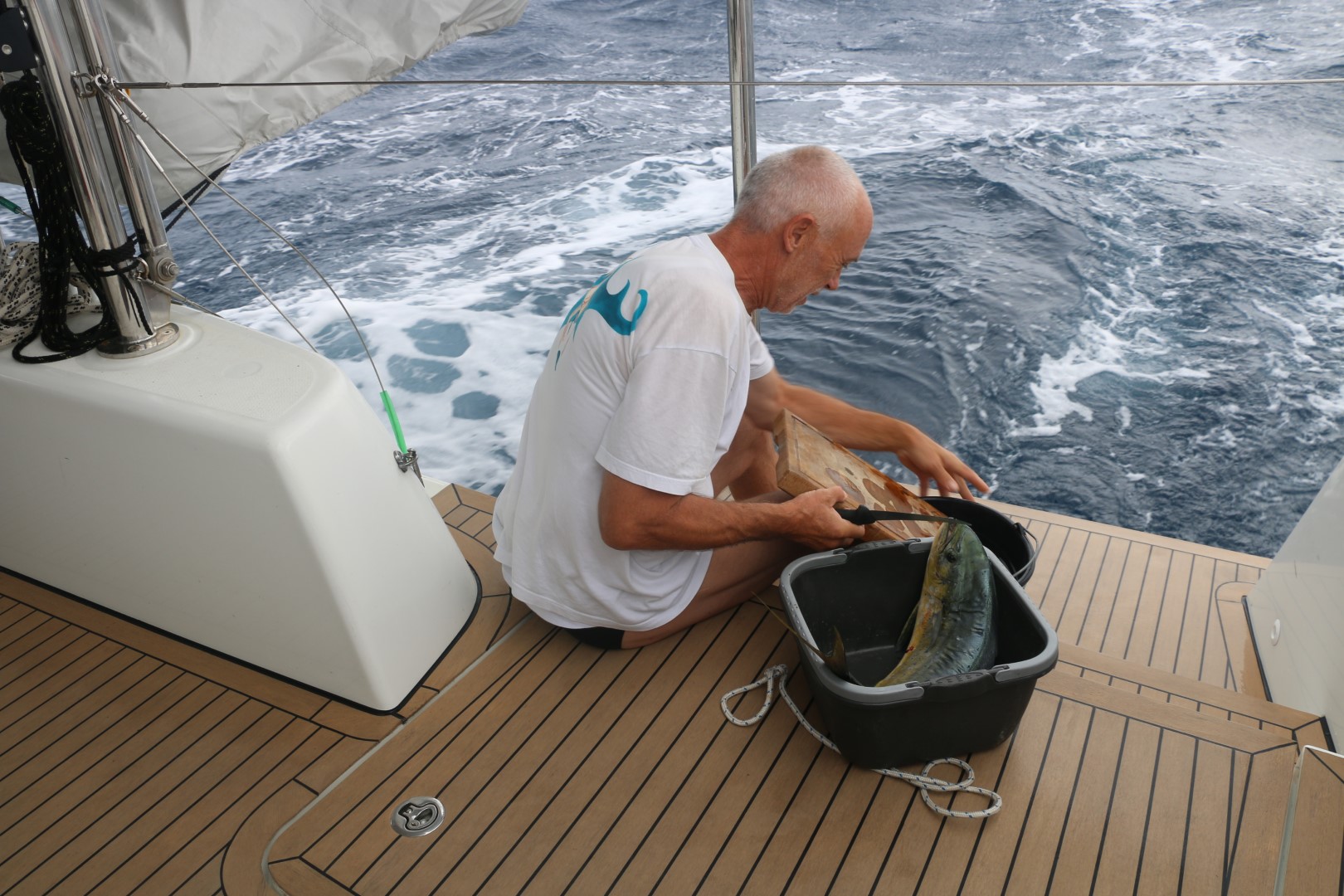 Aber heute bei der ersten Dämmerung "mache" ich meine ersten vier Fische. Gut - die Angel habe ich noch gar nicht ausgebracht. Da liegt es also nicht dran. Nein - es liegt auf dem Oberdeck und im Trampolin. Vier fliegende Fische. Das Gute: Alle schon tot. Brauche ich nur noch einzusammeln. Ein kleines Geschenk von Neptun. Dem haben wir zu Beginn der Fahrt ordnungsgemäß geopfert. Nun gibt er zurück.