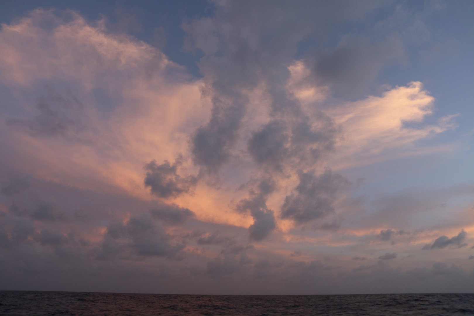 Ich liebe es, wenn der Mond die Nacht erhellt, wenn man nicht nur in Stockdunkelheit blickt. So sieht man den Horizont, die Wellen. Und selbst der Mond passt sich den Gegebenheiten an und hat beim Untergehen die Form eines Schiffes, also selbstverständlich nur um und bei Halbmond. In unseren Heimatgefilden sieht er so aus als ob er stehe, hier liegt er...