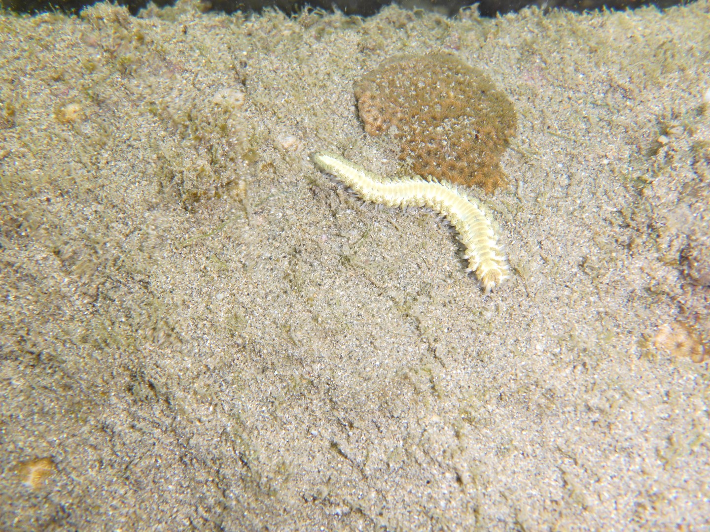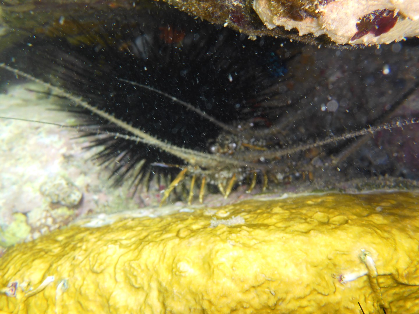 Dazu bieten wir: die erste Languste, eine lange „Spaltkoralle“, meinen schwarzen Liebling mit dem blauen Strahlen, Eier von einer uns unbekannten Spezies – die sind recht hart, fast wie Glas anzufassen, einen Wurm, der mal so platziert war, dass man ein ordentliches Foto machen konnte. Ein paar alte Bekannte, trotzdem noch einmal. Und als Titelbild das Heck der Re!