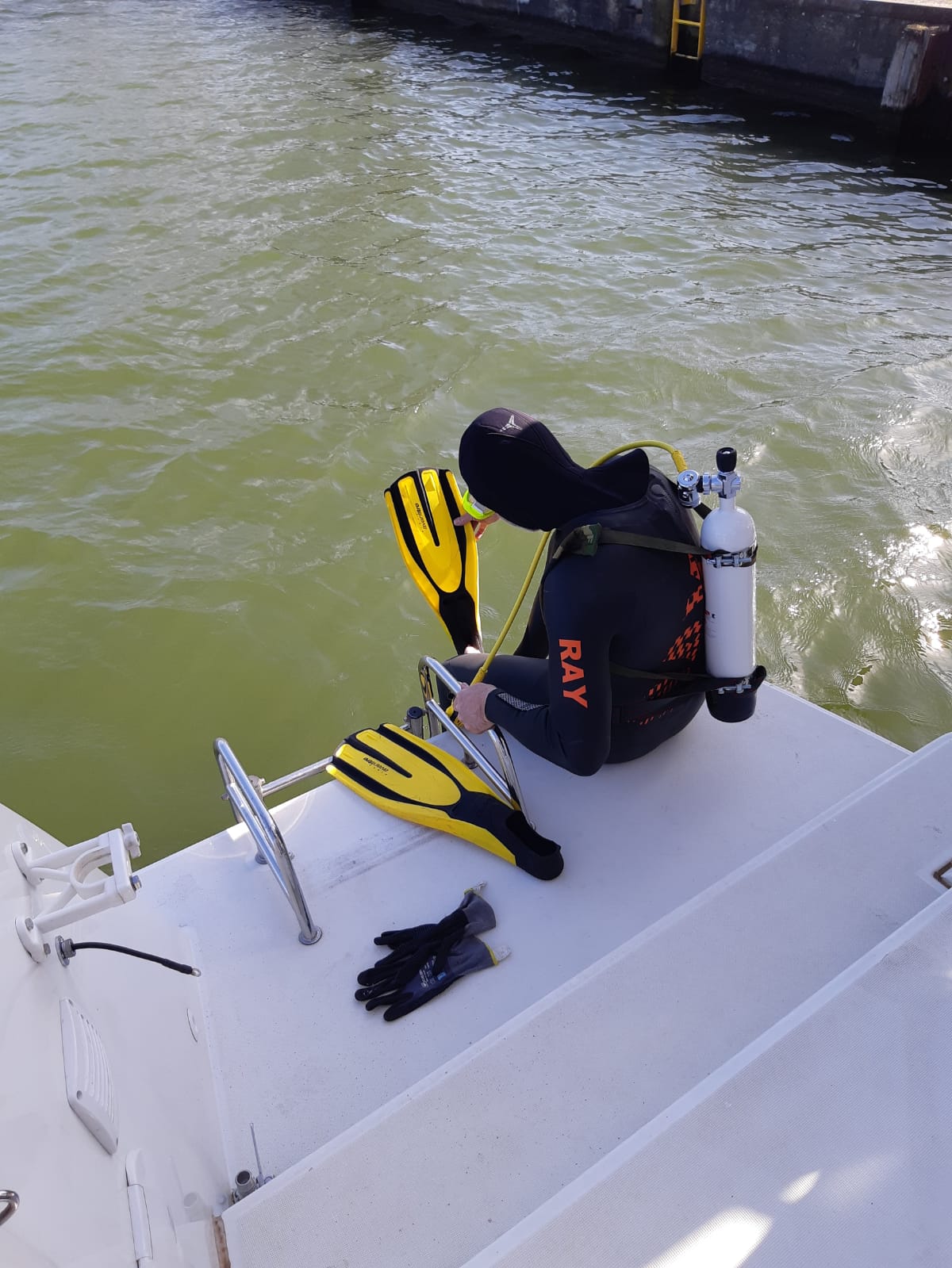 Die Inspektion des Unterwasserschiffes zeigte, dass der Bewuchs aus dem Salzwasser eher weniger geworden ist. Der Impeller des Geschwindigkeitsmessers ist schön frei beweglich. Und "Macken" haben wir nur eine kleine. Ein paar Schleifspuren an beiden Flossen, das war's.