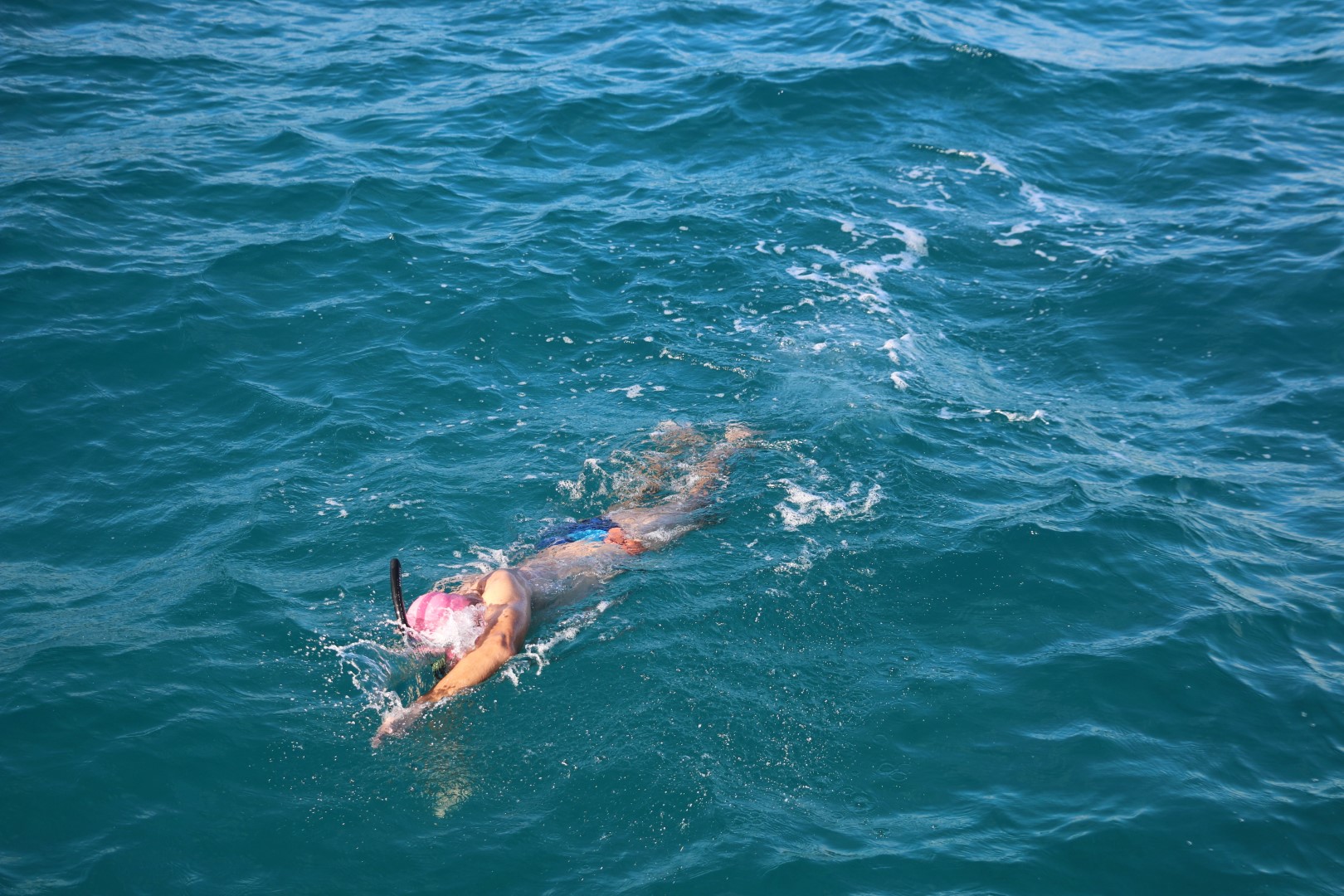 Mit einem Laser-Entfernungsmesser von der achteren Plattform unsere Ankerboje vermessen: 47 Meter. Hin, zurück auf der anderen Bootsseite und dann min. 8 Meter ums Heck rum: Gute 100 Meter pro Runde. Also 30 Runden! In Gran Canaria hatte ich mir noch einen Zentral-Schnorchel geleistet. Das Ding ist super! Denn bei 5 Windstärken hier am Ankerplatz haben wir doch eine krüschelige Welle mit ca. 20 Zentimeter Höhe. Macht das Atmen beim Schwimmen unangenehm. Da kommt oft Wasser mit…. Mit dem Schnorchel habe ich da überhaupt keine Probleme. Michèle gibt nach 5 Runden auf. Ist einfach zu blöde zu schwimmen mit der Welle. Und ich behalte auch zum Brustschwimmen erstmals den Schnorchel an. 20 Runden Kraul, dann immer eine Runde Brust, eine Kraul. Am Ende bin ich sehr zufrieden: 30 geschafft!
