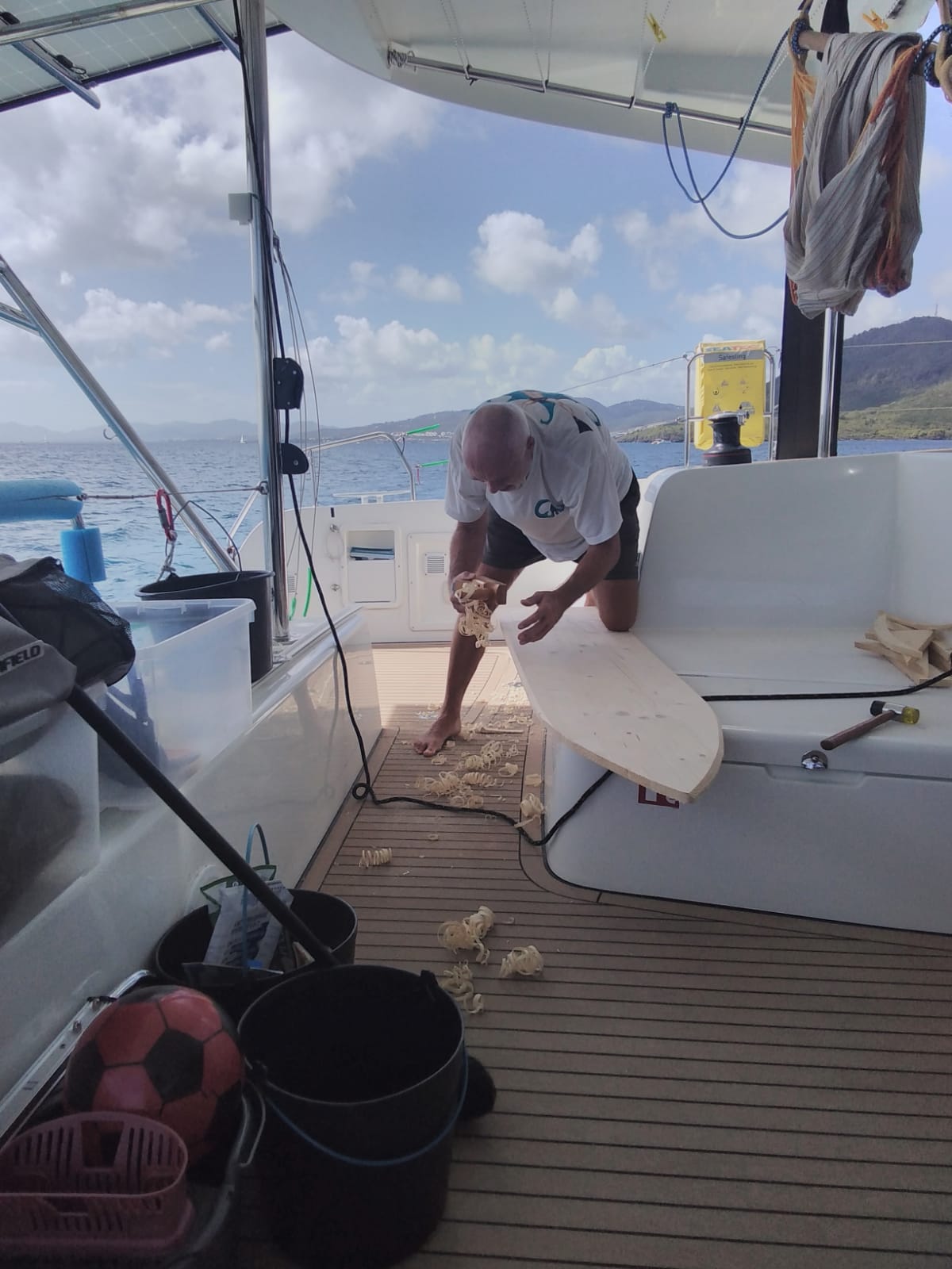 Der Bau des Bodens für das Dinghy läuft weiter. Heute bis zum Schleifen gekommen.