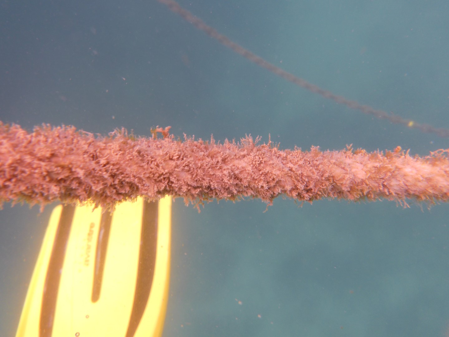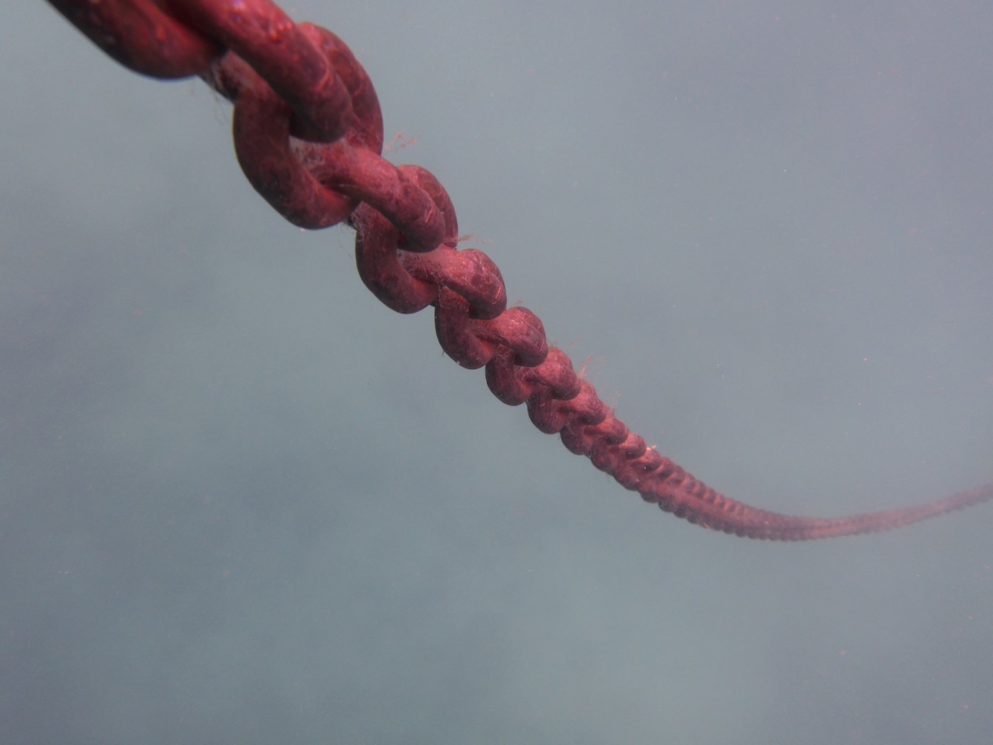 Nachdem ich heute früh die Sonnensegel fertig gesäumt hatte, ging es ins Wasser: Die Tampen des Hahnepots bürsten. Und da bekomm ich einen Schreck! Denn unsere Ankerkette, die ist weg! Also zumindest die ersten Meter, die so gerade mal ins Wasser hängen. Stattdessen eine grau-grüne bis braune Algen-Schlange. So ähnlich sehen die Tampen des Hahnepots aus. Da ist ne Menge Arbeit mit der Bürste zu tun….