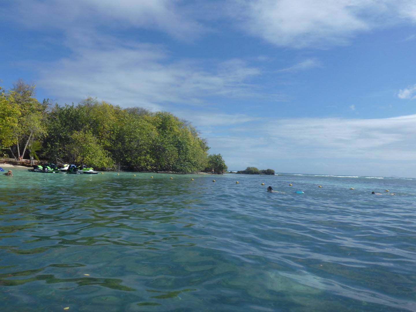 Die Insel entspricht dem Karibik-Ideal! Türkises, warmes Wasser, ohne Regenschauer dann auch schöner Sonnenschein. Eine Menge Leute auf Schnorcheltour! Also plumpsen wir ins Wasser. Seegras in vielleicht 70 cm Wassertiefe. Gut – mit dem Schlauchboot im Schlepptau Richtung Außenriff. Über eine endlose Seegras-Wiese. Das Wasser hat zwischen 40 Zentimeter und vielleicht 1 Meter Tiefe. Und der Boden hat - - Seegras. Langweilig!!
