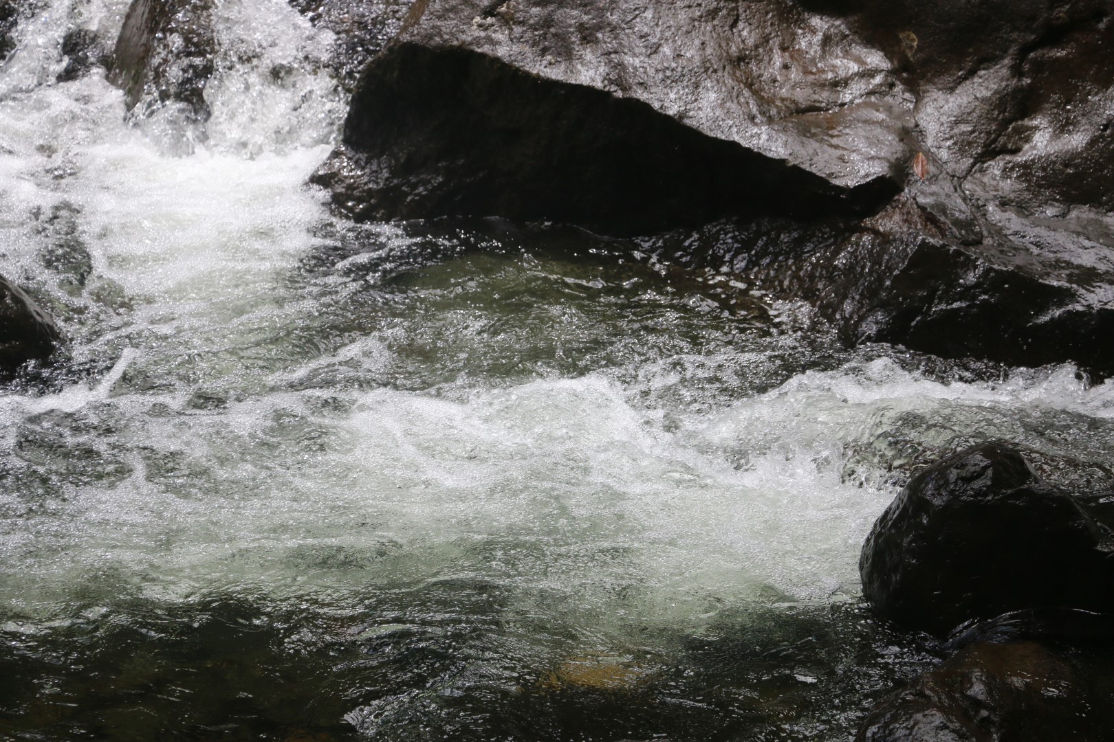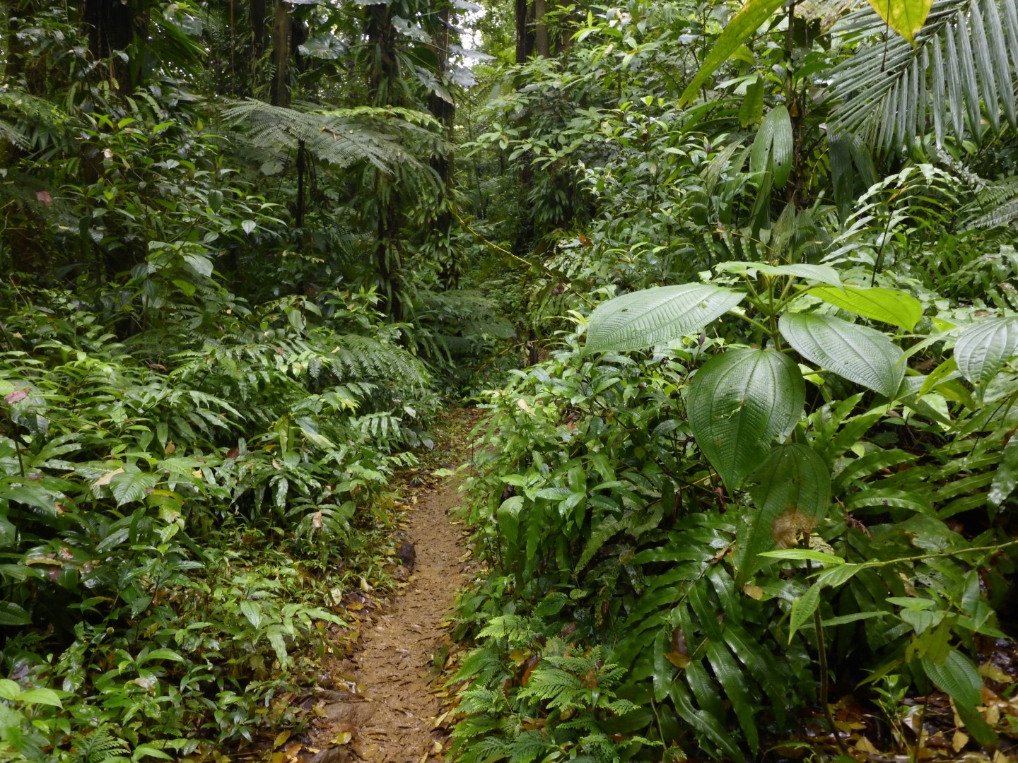 Einige Franzosen haben regenwald-richtige Kleidung an: Badehose, Walking-Stöcke und Turnschuhe. Bei der zweiten Begegnung bin ich gewappnet und kann das dann „einfangen“. Die letzten Meter zum Wasserfall sind verboten: Es geht steil abwärts, ist aber auf den entscheidenden Metern mit einem Tampen gesichert. Unten – wie soll es bei einem Wasserfall anders sein? - recht hohe Luftfeuchte. Zum Baden können wir uns nicht entschließen, es hat deutlich unter 26° Wassertemperatur. Für die 5 Kilometer und 440 Höhenmeter haben wir am Ende dann bald 3 Stunden benötigt. Nun – das waren natürlich die vielen Foto-Stopps!