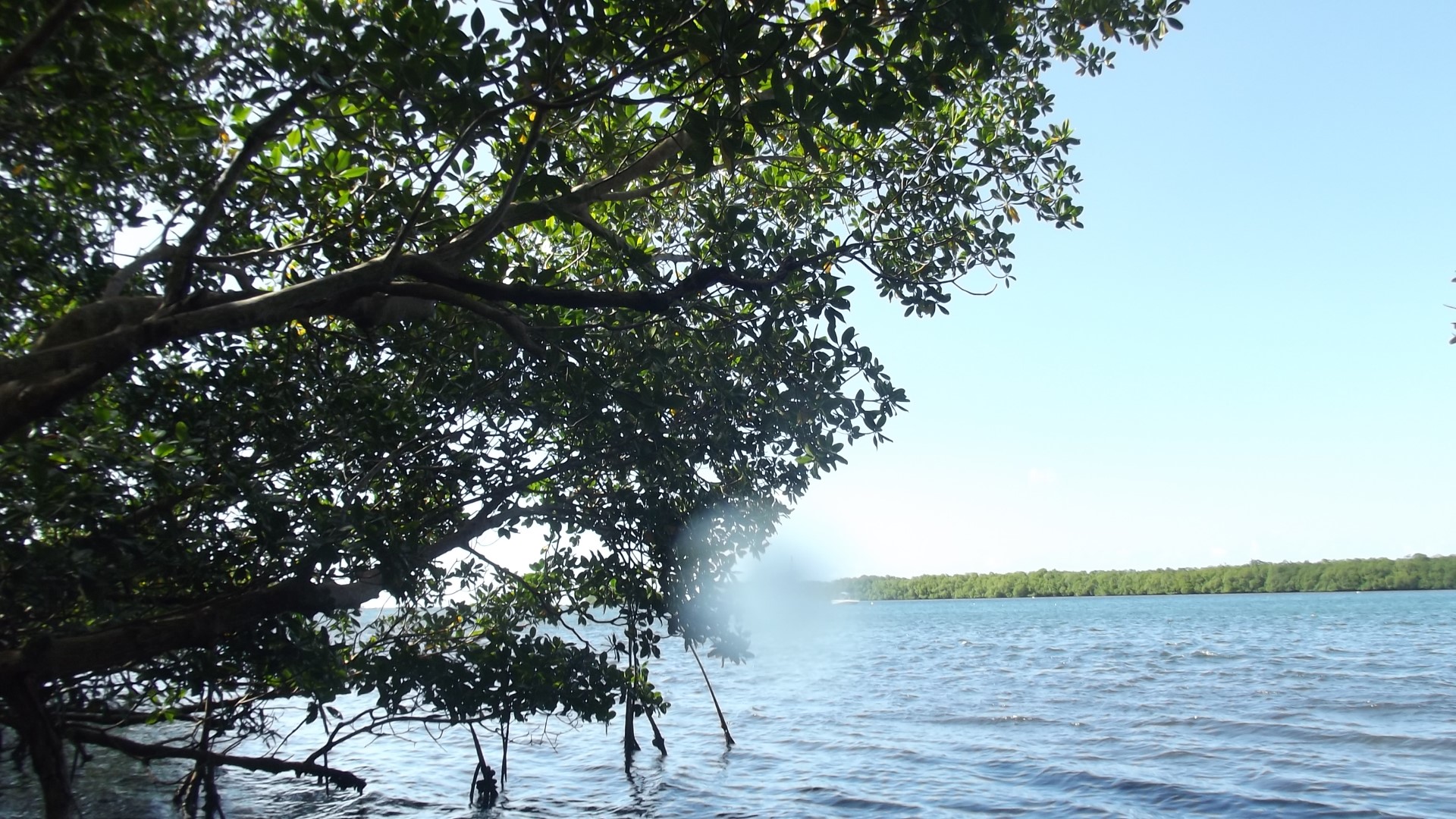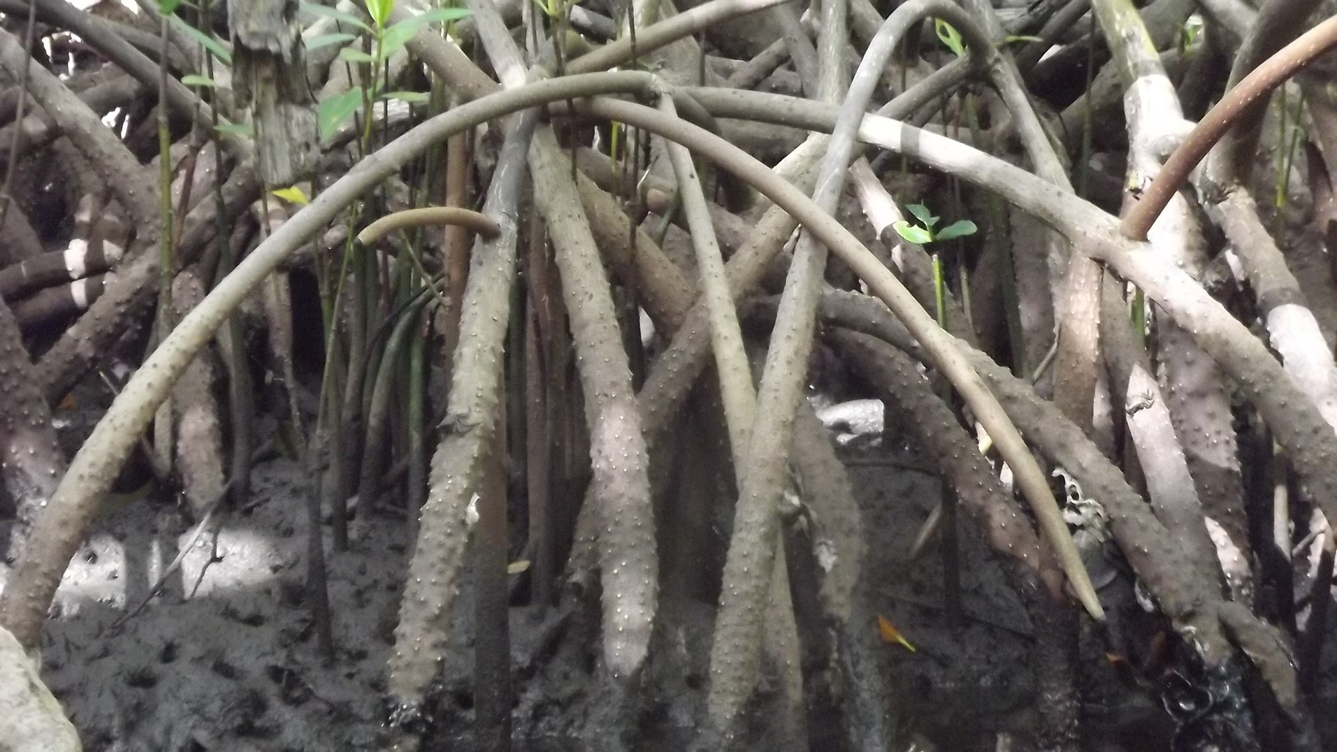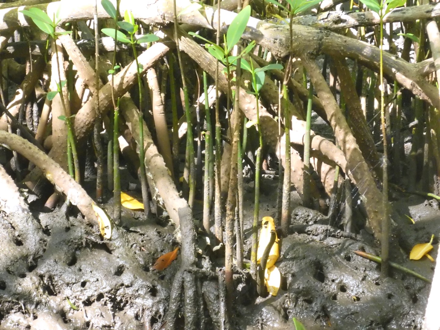 Gegen 14:00 startet die Tour. Es ist eine faszinierende Runde mit vielen neuen Einblicken in diese uns doch eher unbekannte Natur. Und da wir so gut pedalieren, meint Raoul, unser Guide, würde er die Tour etwas erweitern. Uns rinnt jetzt schon der Schweiß aus allen Poren und die Sonne drückt unbarmherzig vom Himmel. Wir befinden uns hier quasi am Scheideweg der Wolken; wir sehen zur einen Seite, landeinwärts, wie sich tiefschwarze Wolken bilden und weiterziehen, über uns jedoch brütet die Sonne und kein Wölkchen bedeckt sie. Was wäre uns jetzt einer der vielen Schauer willkommen! Aber nein! Zu allem Überfluss mussten wir auch noch dicke Schwimmwesten anlegen, welche nicht unbedingt für Kühlung sorgen! Die Tour führt durch einen Tunnel durch den Mangrovenwald, zu einer weit entfernten Insel, wo wir absteigen dürfen und alleine durch einen Tunnel in den Wald waten dürfen. Das Wasser wird dann doch etwas arg tief und keiner hat Badezeug dabei (hat uns Raoul leider nicht mitgeteilt), so dass wir nicht sehr weit laufen. Weiter geht es zu einer Vogelinsel. Hier brüten in den Mangroven irgendwelche Vögel (leider haben wir nicht aufgepasst, so dass ich nicht berichten kann, um welche es sich denn handelt! Es sind diese weißen „Reiher“, die so gerne auf den Kühen stehen. ). Sie haben einen weiten Weg bis an Land, um Nistmaterial und Futter zu besorgen. Trotzdem ist diese Insel für sie am geeignetsten, da sie hier keine Fressfeinde haben: die Mangroveninsel ist noch nicht mit Erde bedeckt, so dass sich keine Katzen, Ratten u.s.w hier aufhalten können. Der Wald ist schon deutlich entlaubter als die Mangroven auf den Nachbarinseln. Der Kot der Vögel ätzt das Laub weg. Und sobald der erste Baum den Geist aufgibt und umfällt, macht sich die ganze Bagage auf und davon und somit hat der Wald wieder die Chance, um sich zu regenerieren.