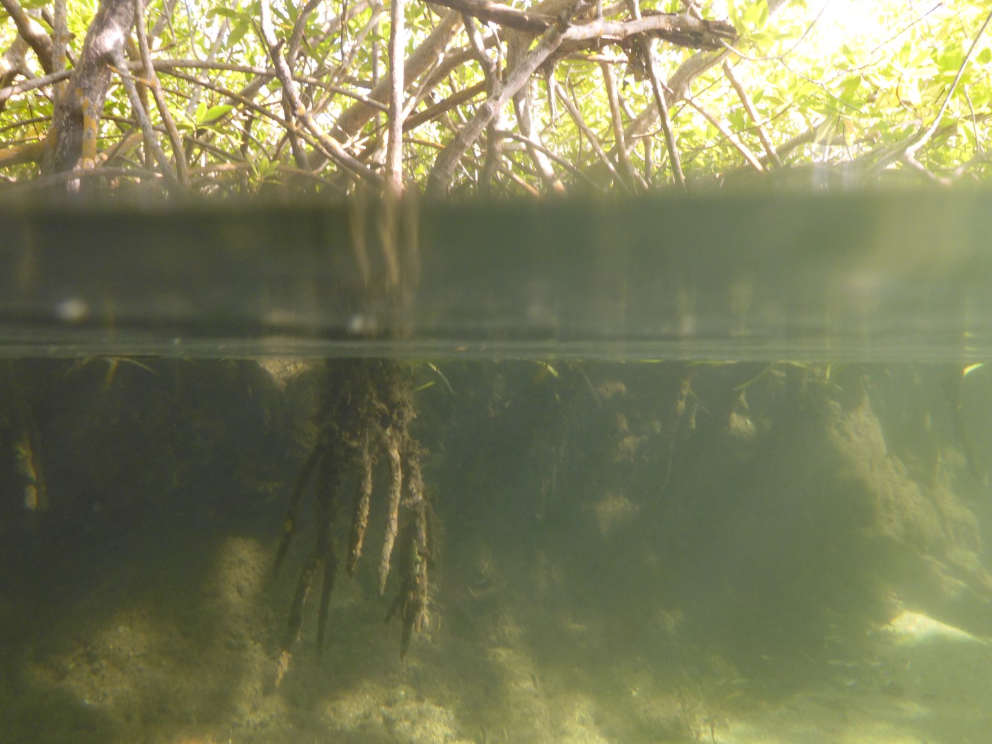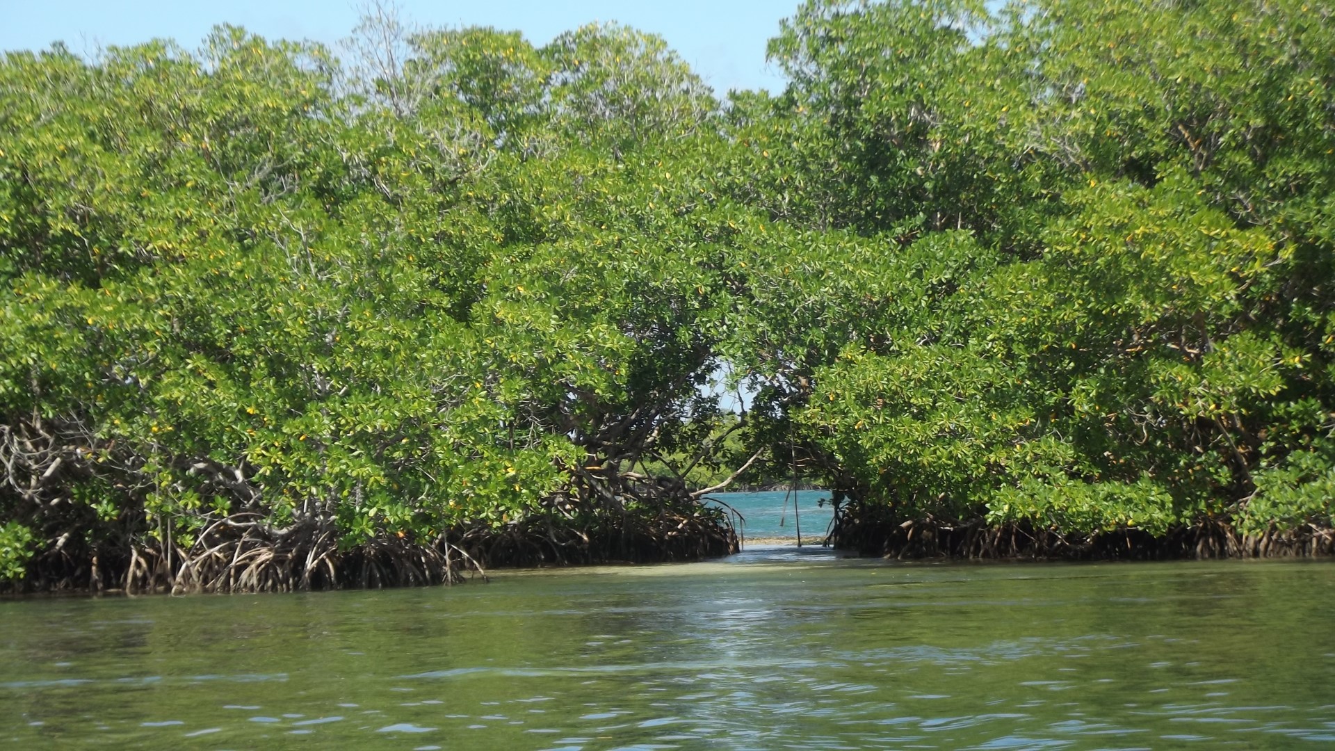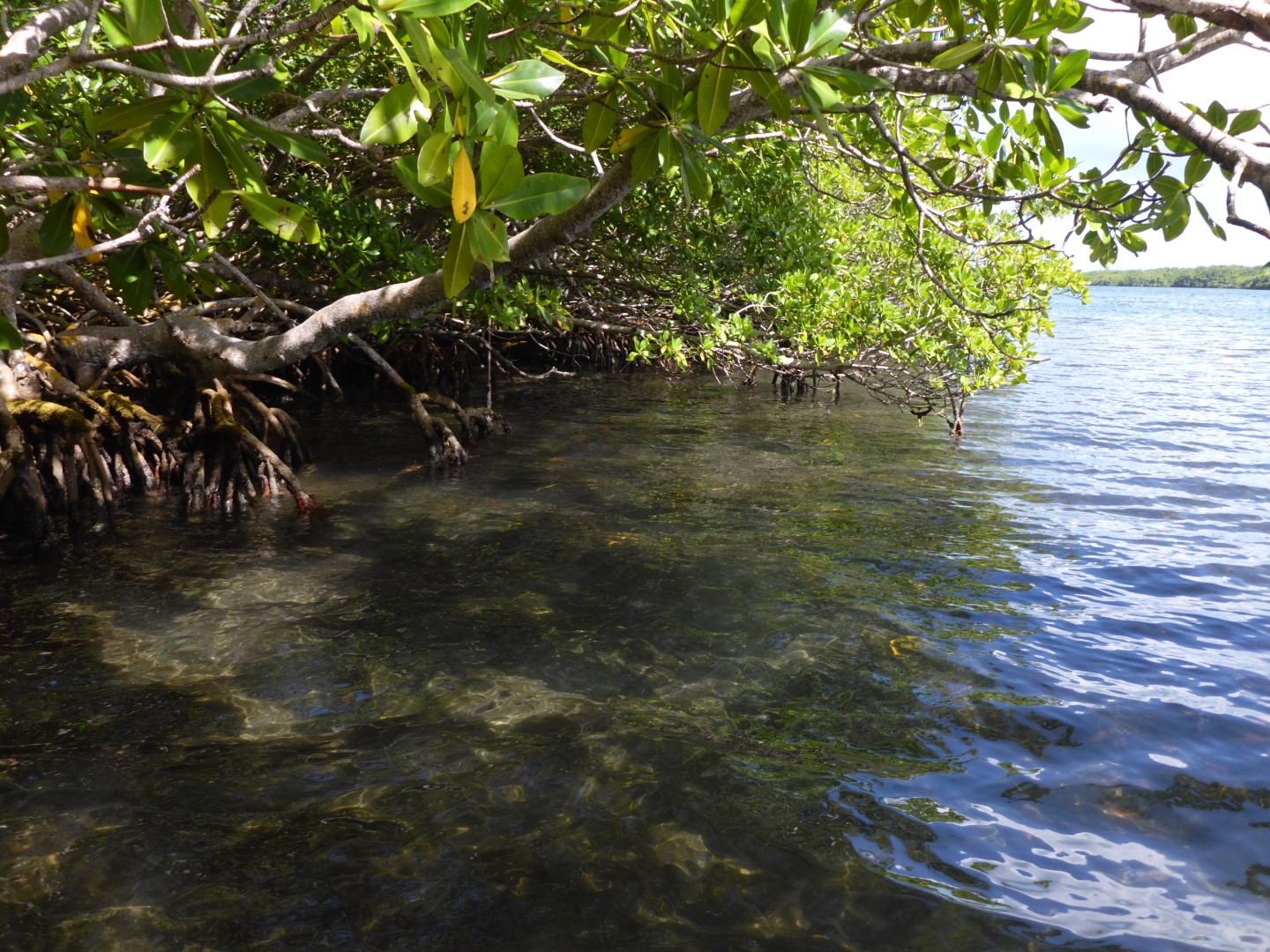 Gegen 14:00 startet die Tour. Es ist eine faszinierende Runde mit vielen neuen Einblicken in diese uns doch eher unbekannte Natur. Und da wir so gut pedalieren, meint Raoul, unser Guide, würde er die Tour etwas erweitern. Uns rinnt jetzt schon der Schweiß aus allen Poren und die Sonne drückt unbarmherzig vom Himmel. Wir befinden uns hier quasi am Scheideweg der Wolken; wir sehen zur einen Seite, landeinwärts, wie sich tiefschwarze Wolken bilden und weiterziehen, über uns jedoch brütet die Sonne und kein Wölkchen bedeckt sie. Was wäre uns jetzt einer der vielen Schauer willkommen! Aber nein! Zu allem Überfluss mussten wir auch noch dicke Schwimmwesten anlegen, welche nicht unbedingt für Kühlung sorgen! Die Tour führt durch einen Tunnel durch den Mangrovenwald, zu einer weit entfernten Insel, wo wir absteigen dürfen und alleine durch einen Tunnel in den Wald waten dürfen. Das Wasser wird dann doch etwas arg tief und keiner hat Badezeug dabei (hat uns Raoul leider nicht mitgeteilt), so dass wir nicht sehr weit laufen. Weiter geht es zu einer Vogelinsel. Hier brüten in den Mangroven irgendwelche Vögel (leider haben wir nicht aufgepasst, so dass ich nicht berichten kann, um welche es sich denn handelt! Es sind diese weißen „Reiher“, die so gerne auf den Kühen stehen. ). Sie haben einen weiten Weg bis an Land, um Nistmaterial und Futter zu besorgen. Trotzdem ist diese Insel für sie am geeignetsten, da sie hier keine Fressfeinde haben: die Mangroveninsel ist noch nicht mit Erde bedeckt, so dass sich keine Katzen, Ratten u.s.w hier aufhalten können. Der Wald ist schon deutlich entlaubter als die Mangroven auf den Nachbarinseln. Der Kot der Vögel ätzt das Laub weg. Und sobald der erste Baum den Geist aufgibt und umfällt, macht sich die ganze Bagage auf und davon und somit hat der Wald wieder die Chance, um sich zu regenerieren.