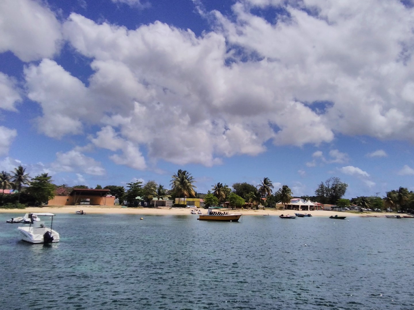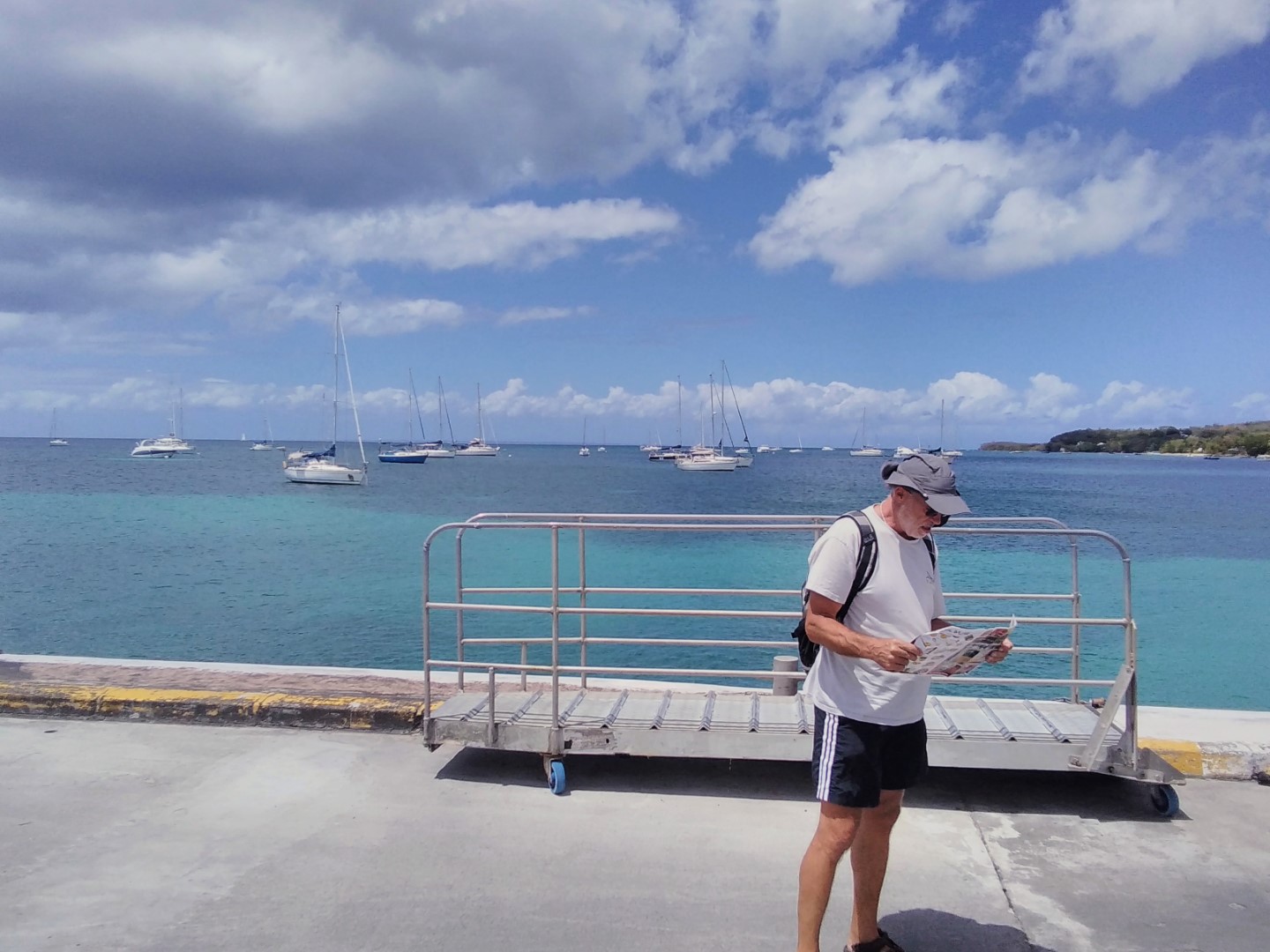 Andrea und Andreas haben für unser heutiges Treffen einen kleinen Spaziergang vorgeschlagen, damit man nicht NUR rumsitzt. Den Vorschlag nehmen wir gerne an, da wir uns leider auch zu wenig bewegen. Den Spaziergang können wir gleich vom Dinghi-Anleger in St. Louis starten, ohne noch lange irgendwohin fahren zu müssen – so wie zu allen anderen „offiziellen“ Wanderwegen. Der Weg führt, immer in Strandnähe, zum Dorfende, am Friedhof entlang durch einen Wald. (Die Friedhöfe sind hier schon ein Erlebnis, allerdings finde ich diesen hier nicht so schön wie den in Morne-à-l’Eau.) So können wir die Vegetation bewundern und einige Informationstafeln über die vom Aussterben bedrohten Krabben, die in Erdhöhlen leben, lesen. Klar, auch die sind vom Aussterben bedroht. Weltweit gibt es wahrscheinlich nur Mücken, Kakerlaken und uns Menschen, die nicht vom Aussterben bedroht sind!